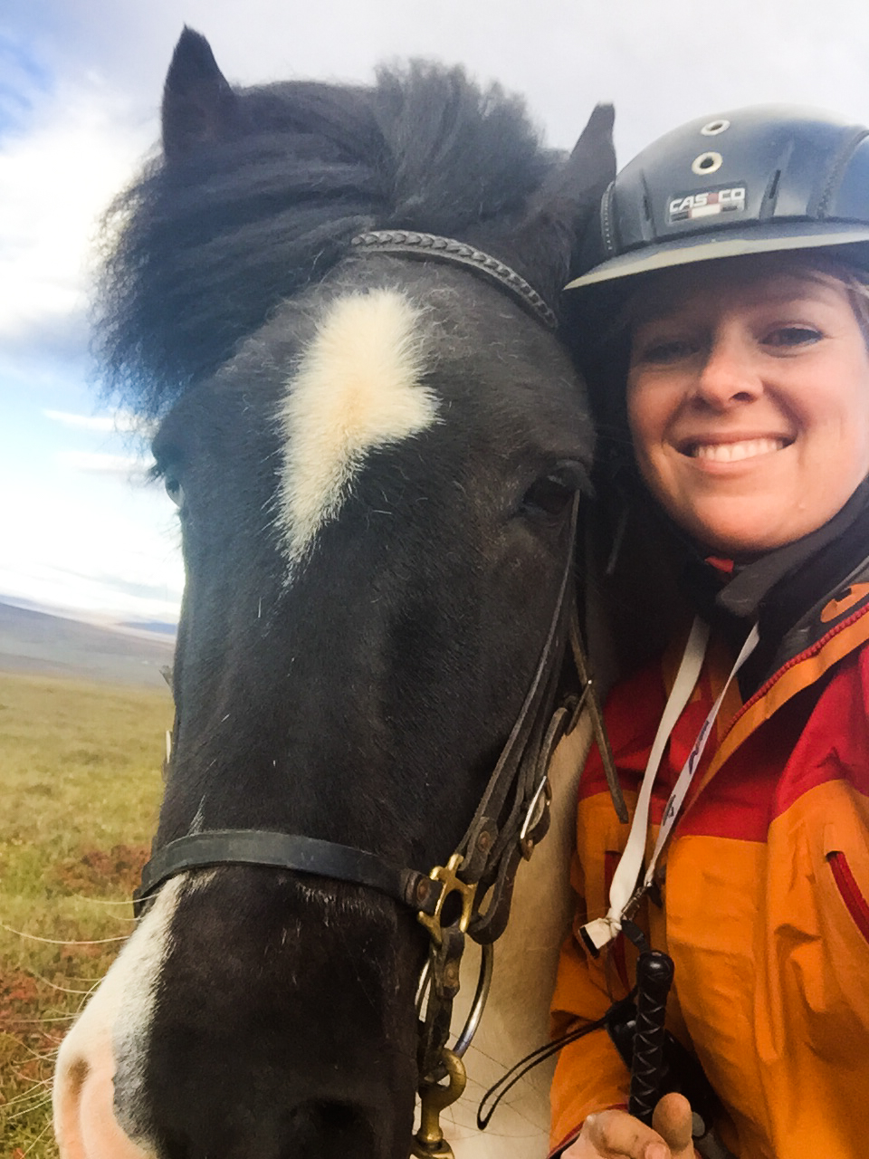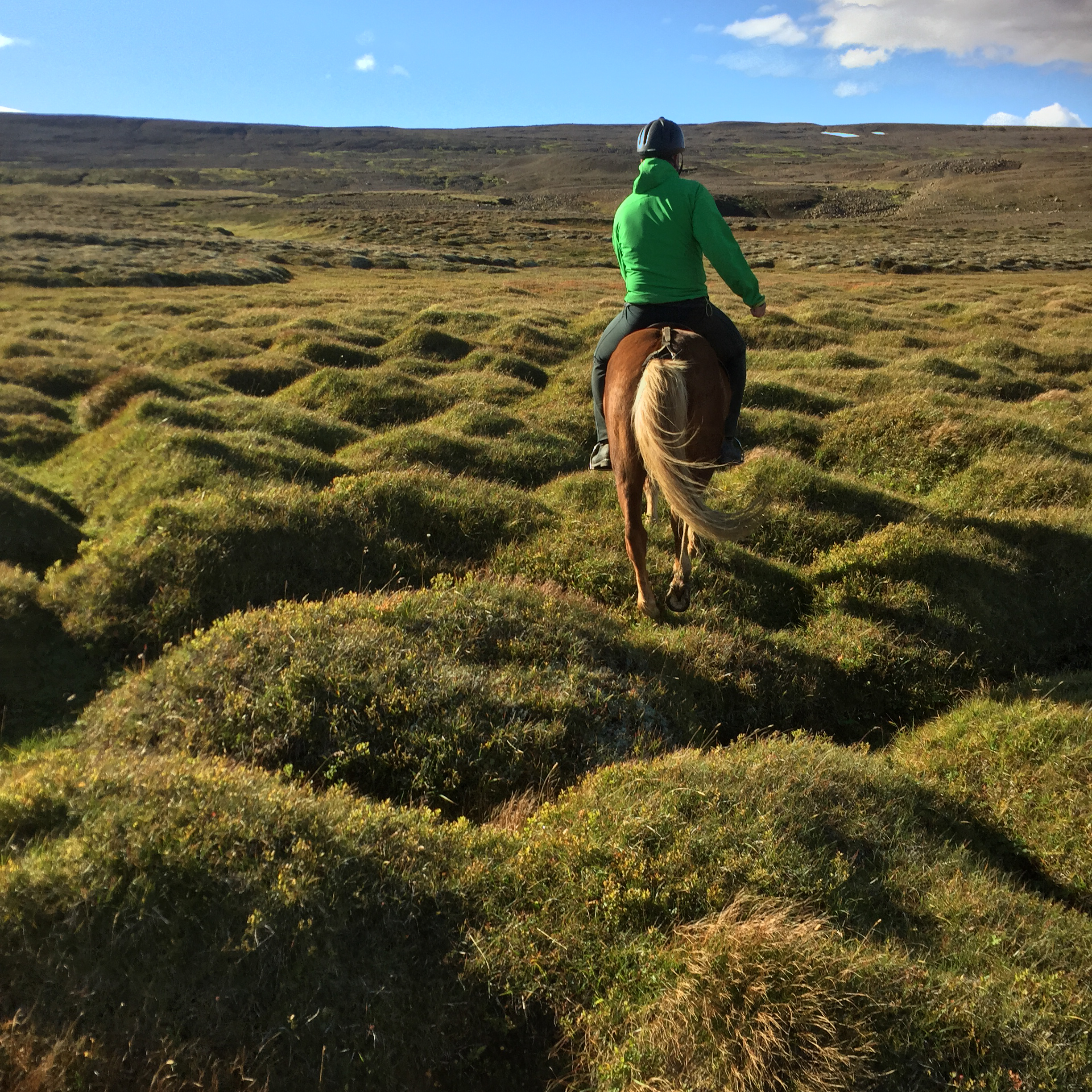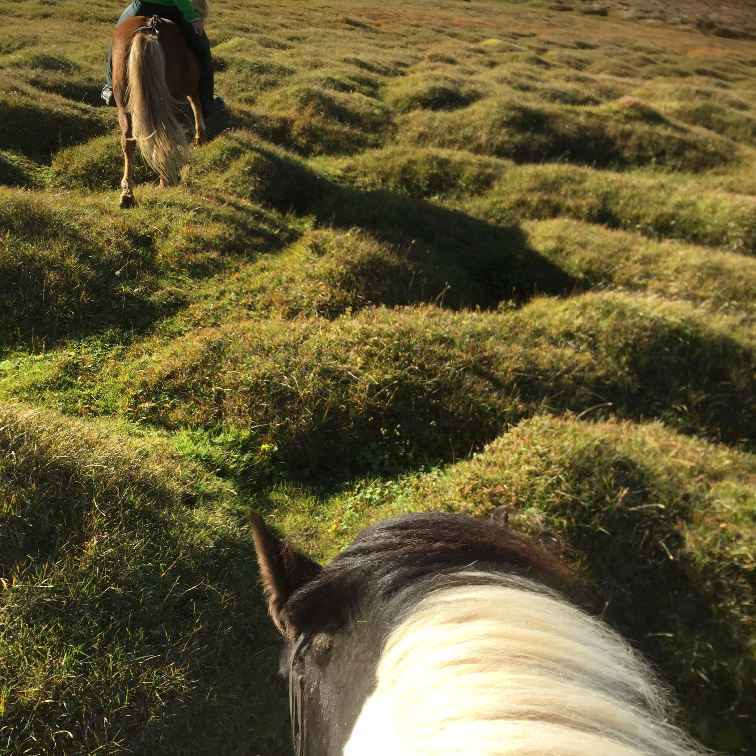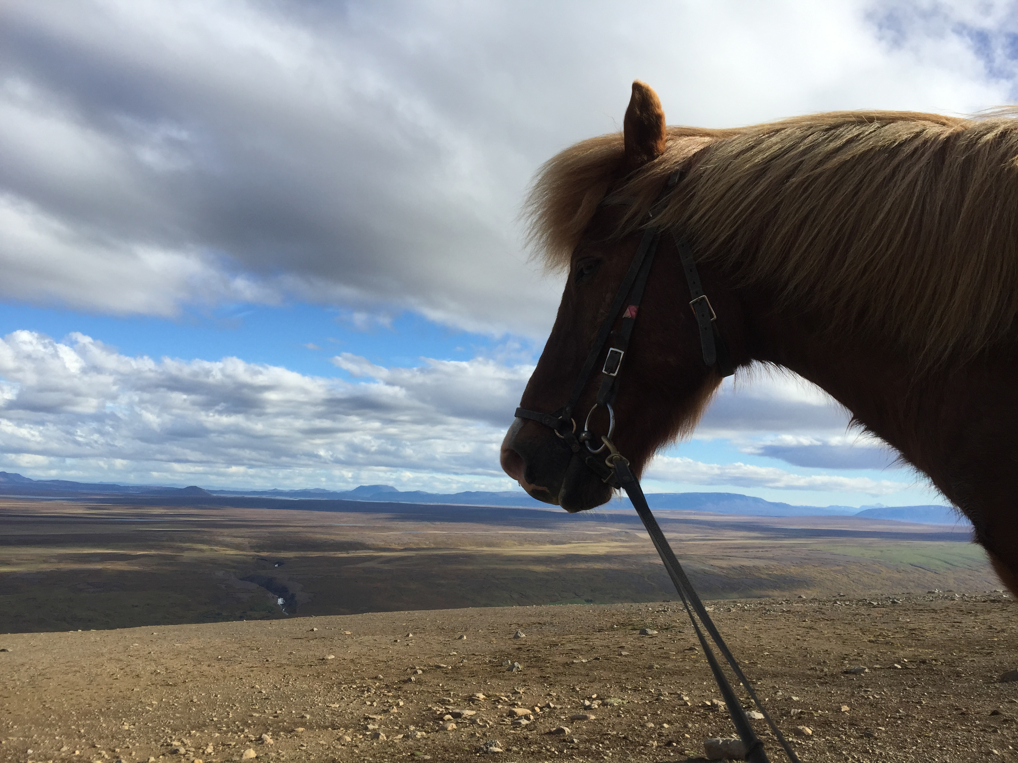 About now I would like to point out that I have done some fairly wild riding, galloped across the Namibian desert with horses falling in quicksand, been chased be elephants in Africa, but 2 hours on the fluffy 12h Icelandic pinto on my own chasing sheep in the mountains of Iceland was one of the most terrifying activities I have ever done. The first 1/2hr went reasonably well, my horse was just following the sheep at a good pace and we seemed to be doing ok, managed to collect a few extra sheep- and was actually feeling quietly confident…. I was focused and unconcerned about where i was going or where I had come from. And then it was as though the sheep realised they were being chased by a rookie and turned rogue….and it was game on…. we were winding along a river gorge, previously mostly on the flatish (very debatable) area above the sides of the gorge… we had already gone at quiet a pace over those weird boggy bumps- which I was quite sure most Australian horses would’ve broken a leg in. It was from this point I had one hand permanently in the mane and one of the reins. Happy the very sweet and happy Collie dog had joined me – again realising my in experience he thought it appropriate to guide me… the sheep appeared to jump off the edge of a cliff… and reasonably enough I paused… before following, Happy ran infront of me looked over the edge popped off, popped back up a few seconds later as if to say why aren’t you following?? And then off we went, over the edge…. we traversed the cliff wall, which, lets say was not vertical, but it was not a hill or slope of any recognisable form… my horse wanted to move swiftly along here- and only when I took a small pull did i realise why- we ended up on our side sliding down the side of the mountain for about 5m… I had jumped off as she had fallen… so we both slid a bit… I had a dressage whip, gave the poor horse a tap as we stopped sliding and jumped back on as the horse got traction. Her heart was pounding, as was mine. From that point, no half halts, pulls- if she said no to where I pointed her- I completely concurred. Up and down the gorge through bog, massively steep areas of mud we went, jumping down 3* crevasses from a stand still, across these weird open cracks which seemed incredibly deep, and it just seemed relentless, no area was nice easy footing… it felt like it was all out to kill me… I was still tailing these damn sheep… not as close as I had been as they had had less “oh shit moments”; where are the photos you ask?? At no point was I feeling secure enough to take a hand off either reins or mane to document this experience, and it wasn’t until till we had climbed down and up the ravine for the 15th time that the sheep took a particularly insane route that I finally pulled up. Realising it was about 2hrs since I had seen the others… and there was no sight of anyone anywhere, I decided to head to the highest point of the mountain and abandon my sheep who had also all split up to make my task more enjoyable -they had more chance at survival than i did!! I should say Jon had given me a walkie talkie- but I seemed to be too far out of range for it to work.. so I had no means of finding out where they were. The seemingly endless mountain which was part bog, part crater landscape- all was super mushy after an unseasonably wet summer and full of these massive crevices. The earth would just open up infront of you about every 5 meters, like huge chasms. After waiting 1/2 hr on top of mountain I set out back in the direction I had come from – and eventually saw him silhouetted on a ridge line a long long way away.On our way back down the hill we came across a couple more sheep, which we managed to drive down to the neighbouring farm and into the sheep shed. Lets just say I am looking forward to eating lamb!!!!!!! These sheep had become my sworn enemy!!!