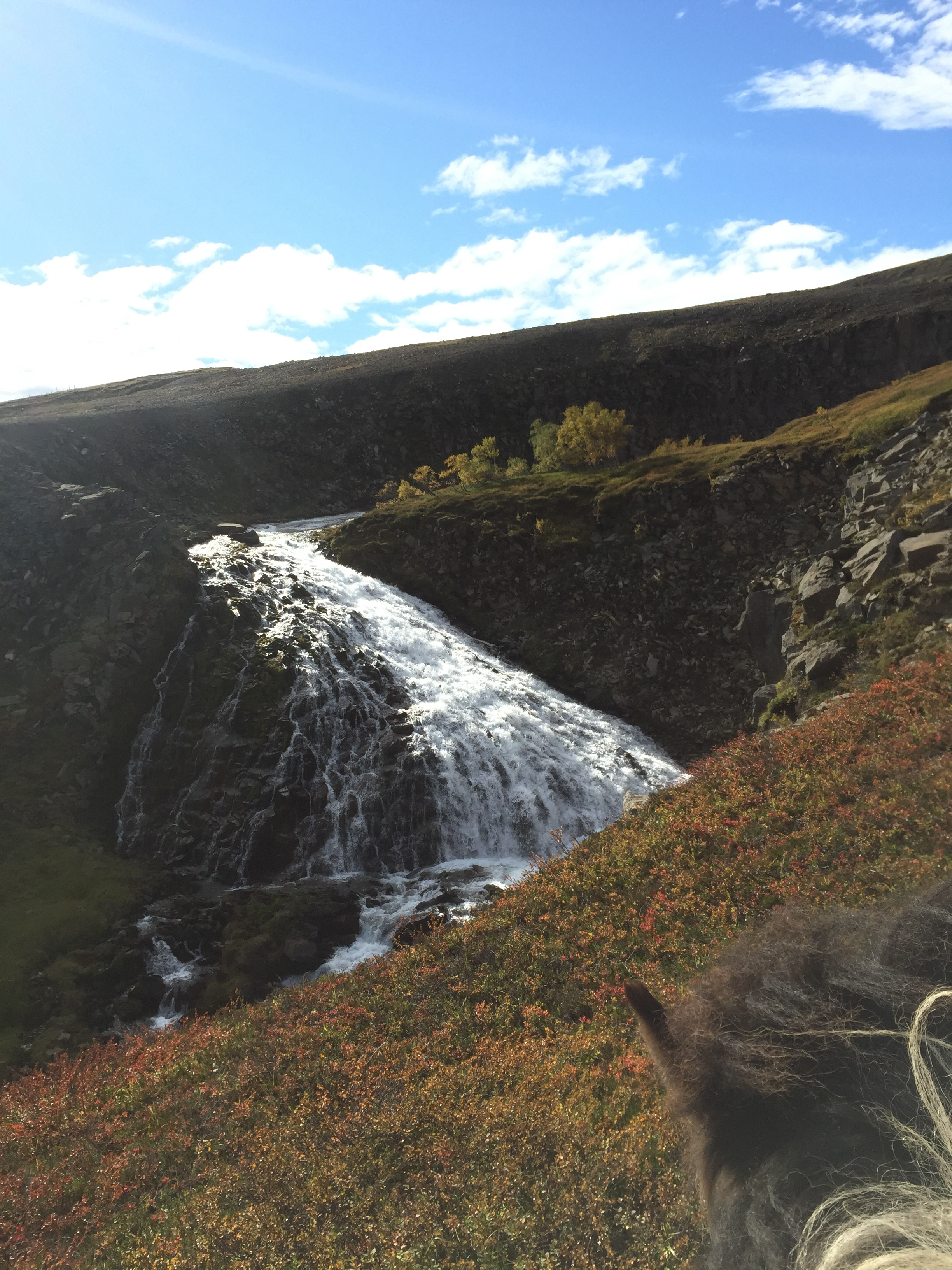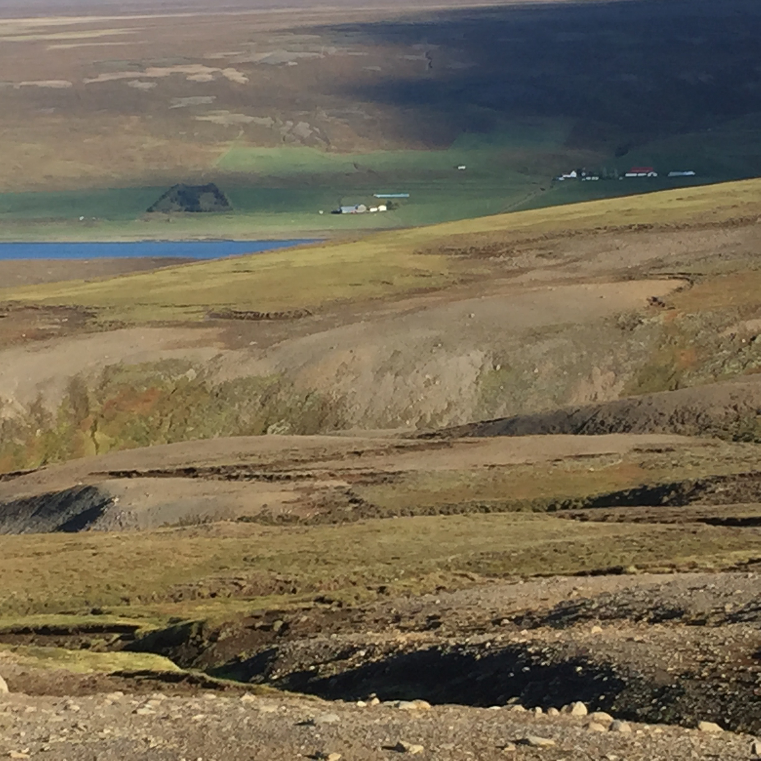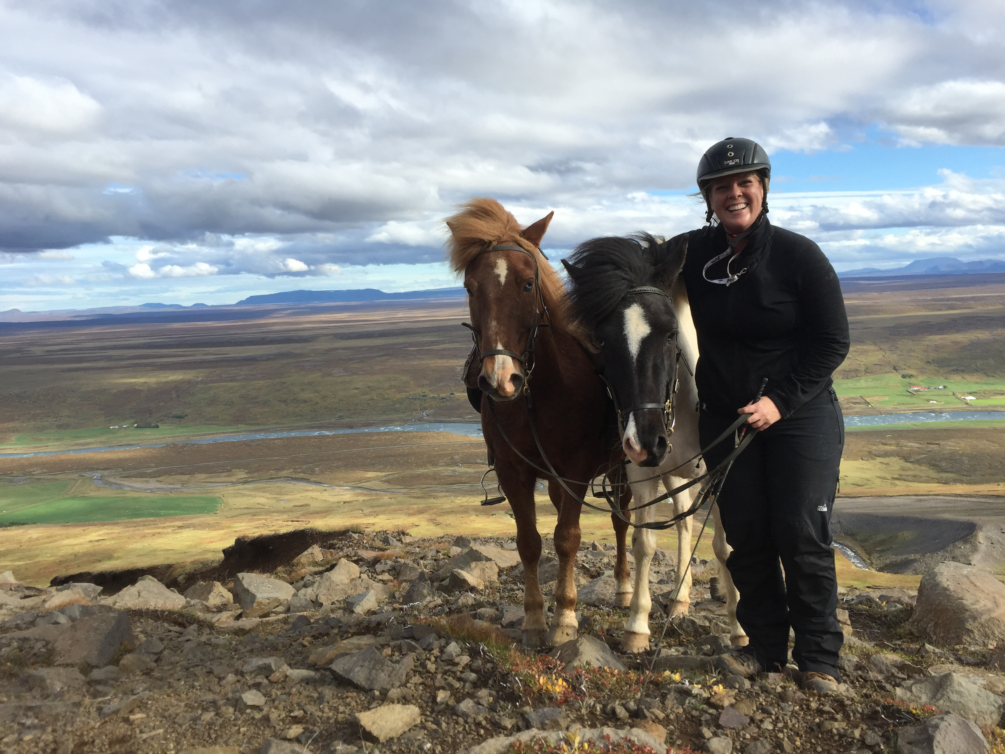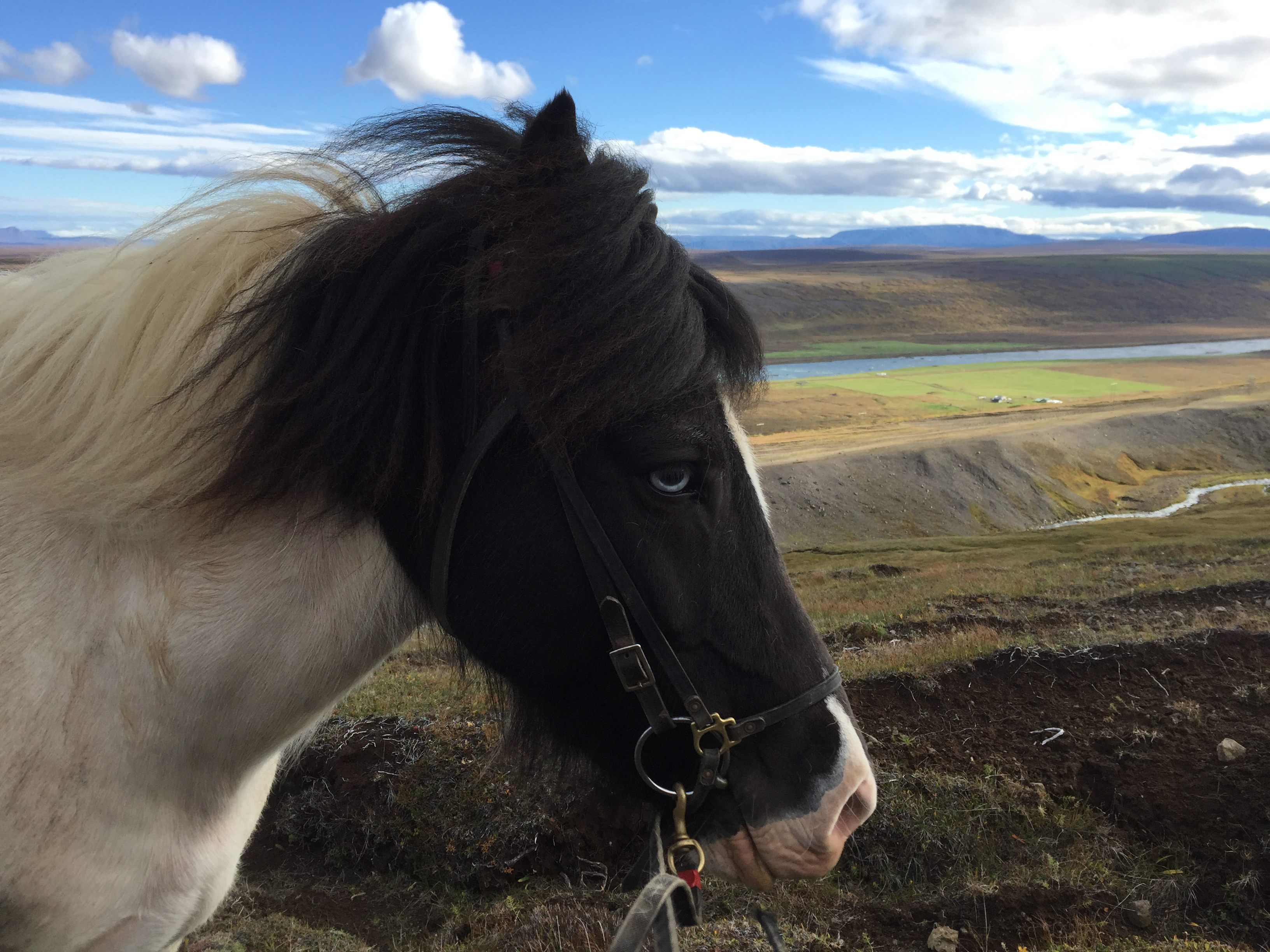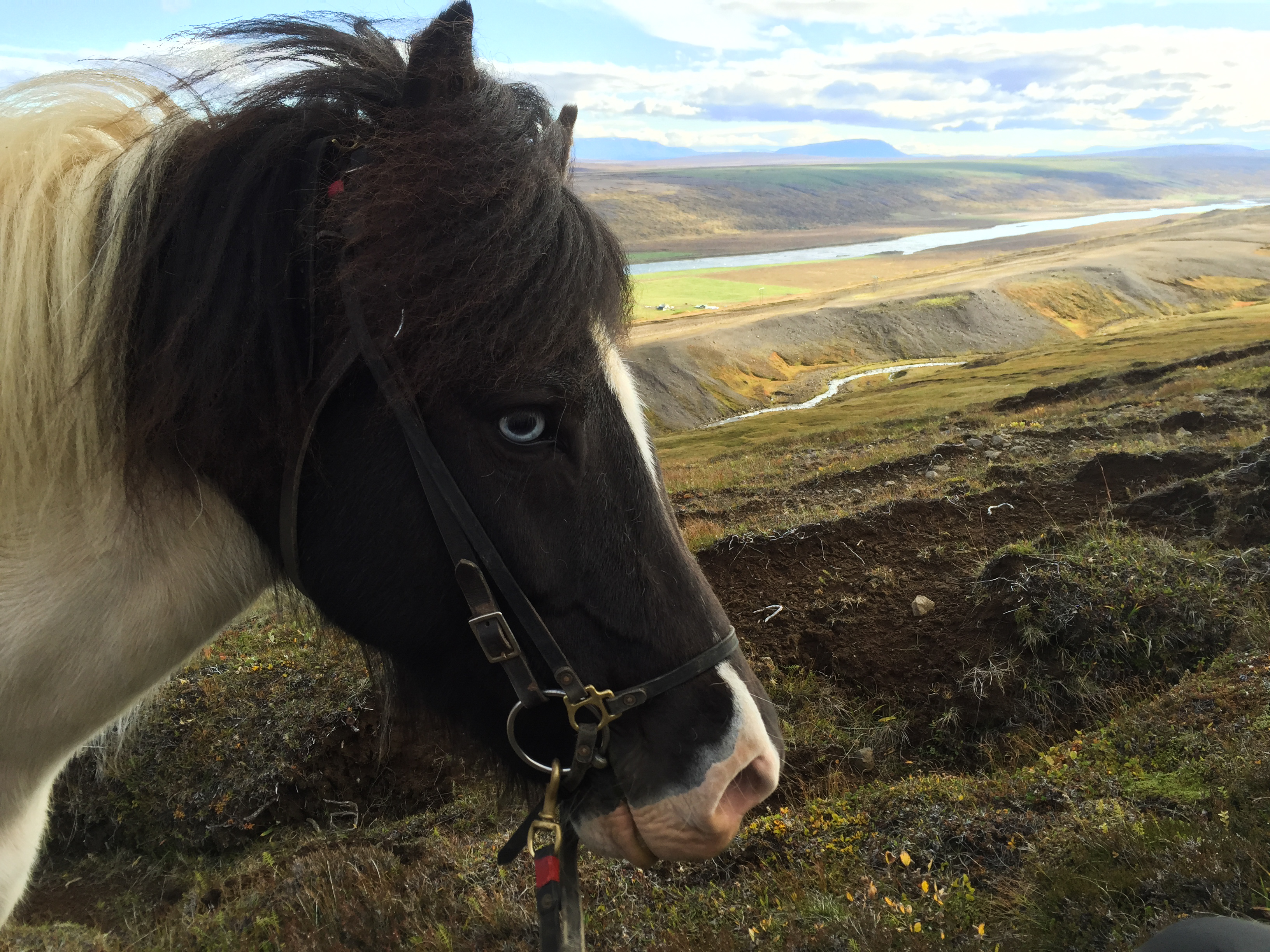 About now I would like to point out that I have done some fairly wild riding, galloped across the Namibian desert with horses falling in quicksand, been chased be elephants in Africa, but 2 hours on the fluffy 12h Icelandic pinto on my own chasing sheep in the mountains of Iceland was one of the most terrifying activities I have ever done. The first 1/2hr went reasonably well, my horse was just following the sheep at a good pace and we seemed to be doing ok, managed to collect a few extra sheep- and was actually feeling quietly confident…. I was focused and unconcerned about where i was going or where I had come from. And then it was as though the sheep realised they were being chased by a rookie and turned rogue….and it was game on…. we were winding along a river gorge, previously mostly on the flatish (very debatable) area above the sides of the gorge… we had already gone at quiet a pace over those weird boggy bumps- which I was quite sure most Australian horses would’ve broken a leg in. It was from this point I had one hand permanently in the mane and one of the reins. Happy the very sweet and happy Collie dog had joined me – again realising my in experience he thought it appropriate to guide me… the sheep appeared to jump off the edge of a cliff… and reasonably enough I paused… before following, Happy ran infront of me looked over the edge popped off, popped back up a few seconds later as if to say why aren’t you following?? And then off we went, over the edge…. we traversed the cliff wall, which, lets say was not vertical, but it was not a hill or slope of any recognisable form… my horse wanted to move swiftly along here- and only when I took a small pull did i realise why- we ended up on our side sliding down the side of the mountain for about 5m… I had jumped off as she had fallen… so we both slid a bit… I had a dressage whip, gave the poor horse a tap as we stopped sliding and jumped back on as the horse got traction. Her heart was pounding, as was mine. From that point, no half halts, pulls- if she said no to where I pointed her- I completely concurred. Up and down the gorge through bog, massively steep areas of mud we went, jumping down 3* crevasses from a stand still, across these weird open cracks which seemed incredibly deep, and it just seemed relentless, no area was nice easy footing… it felt like it was all out to kill me… I was still tailing these damn sheep… not as close as I had been as they had had less “oh shit moments”; where are the photos you ask?? At no point was I feeling secure enough to take a hand off either reins or mane to document this experience, and it wasn’t until till we had climbed down and up the ravine for the 15th time that the sheep took a particularly insane route that I finally pulled up. Realising it was about 2hrs since I had seen the others… and there was no sight of anyone anywhere, I decided to head to the highest point of the mountain and abandon my sheep who had also all split up to make my task more enjoyable -they had more chance at survival than i did!! I should say Jon had given me a walkie talkie- but I seemed to be too far out of range for it to work.. so I had no means of finding out where they were. The seemingly endless mountain which was part bog, part crater landscape- all was super mushy after an unseasonably wet summer and full of these massive crevices. The earth would just open up infront of you about every 5 meters, like huge chasms. After waiting 1/2 hr on top of mountain I set out back in the direction I had come from – and eventually saw him silhouetted on a ridge line a long long way away.On our way back down the hill we came across a couple more sheep, which we managed to drive down to the neighbouring farm and into the sheep shed. Lets just say I am looking forward to eating lamb!!!!!!! These sheep had become my sworn enemy!!!