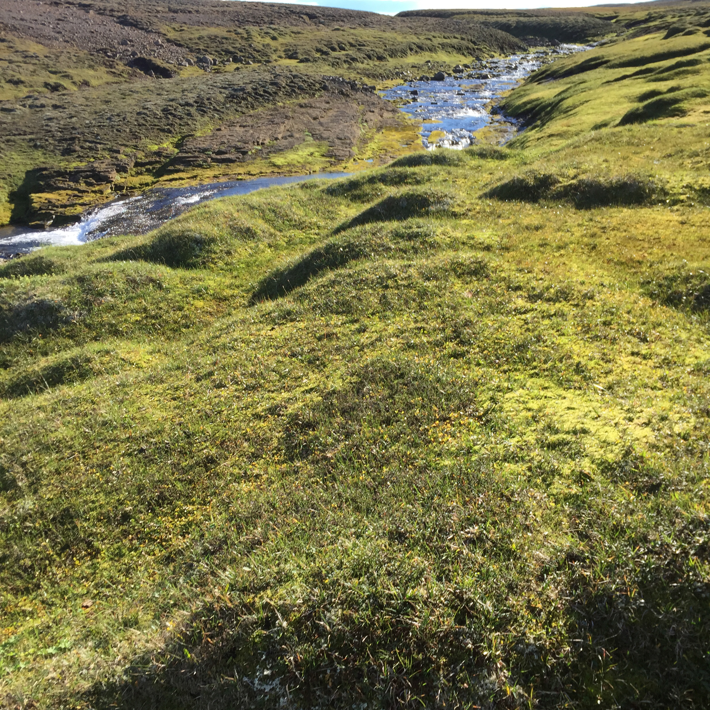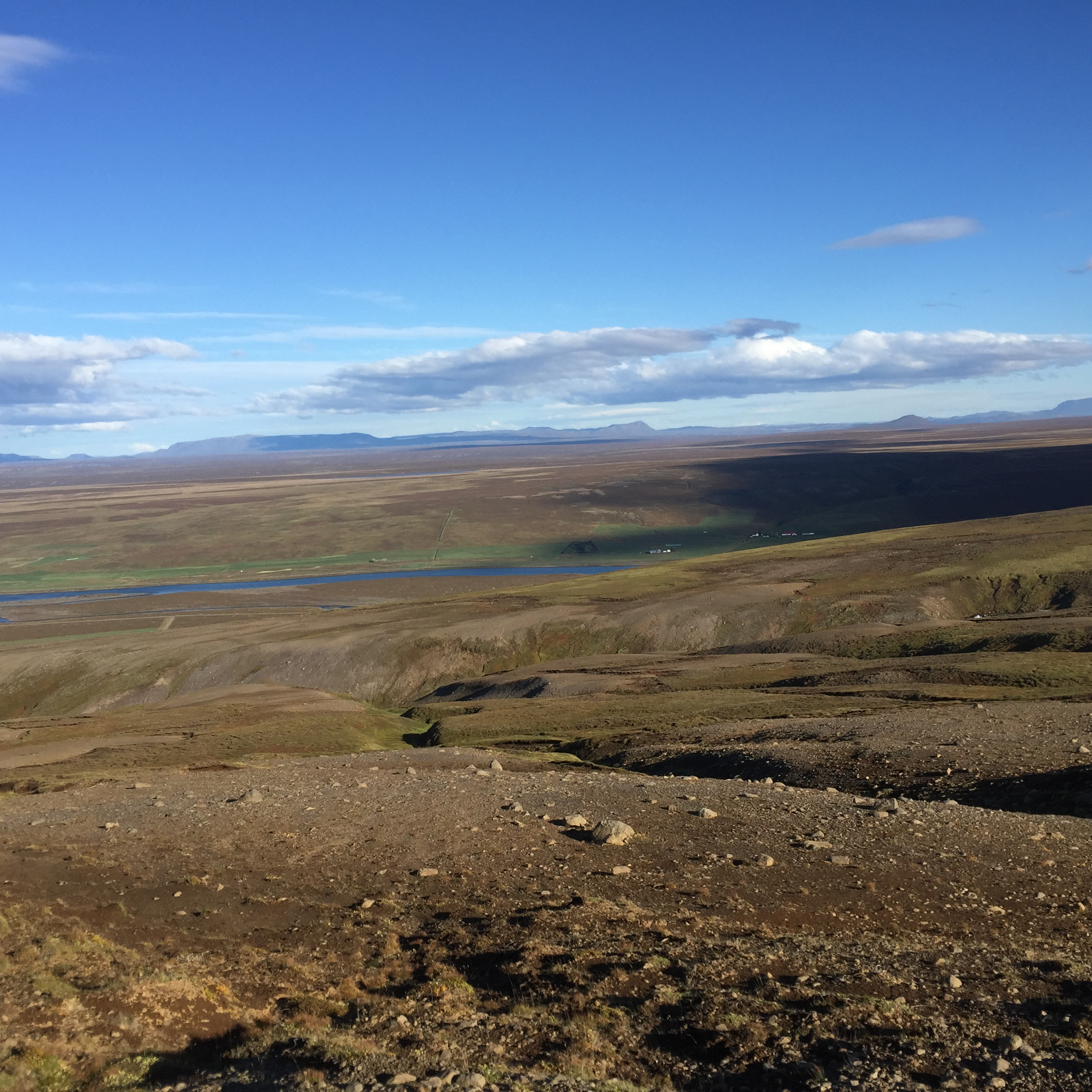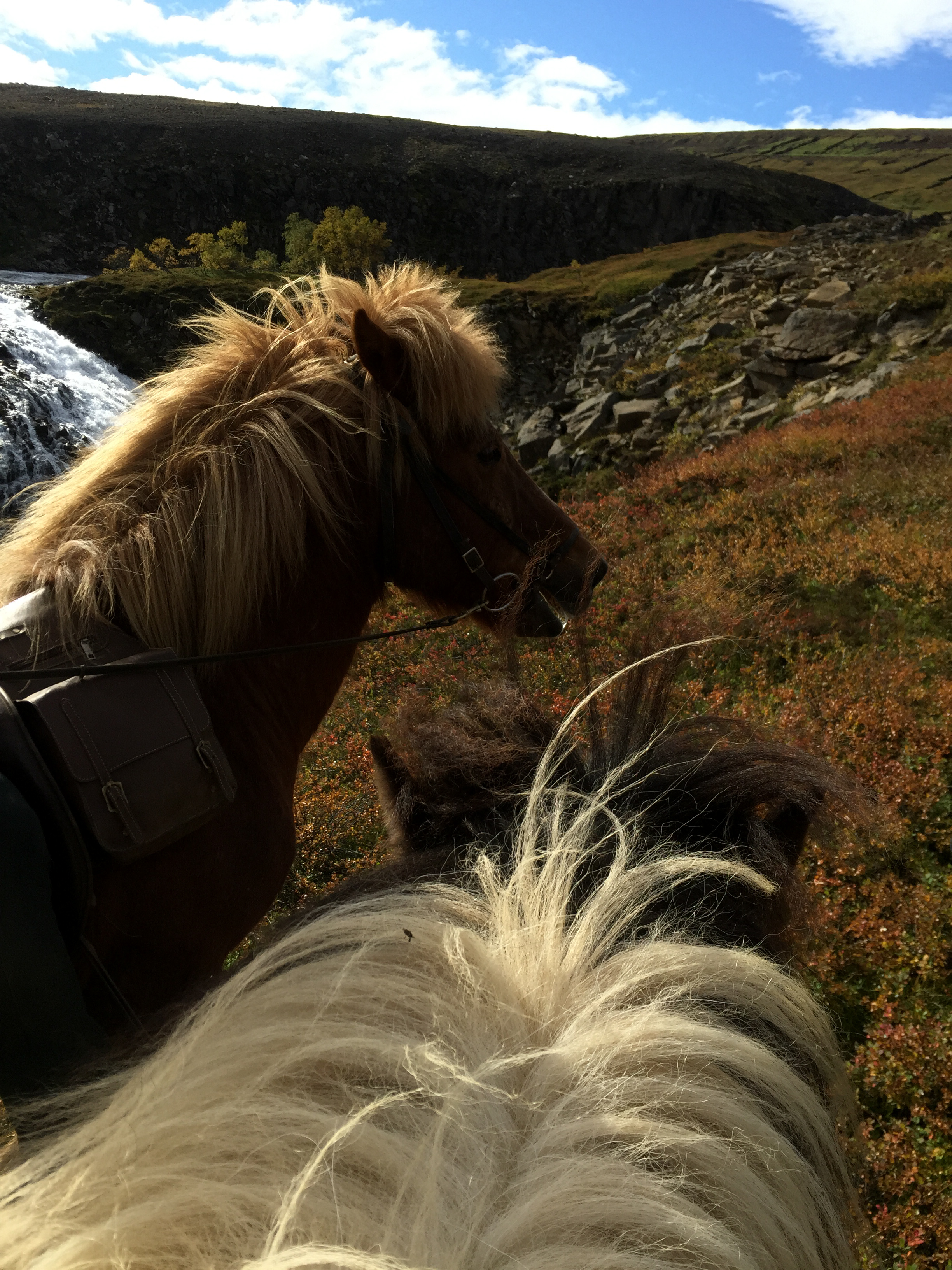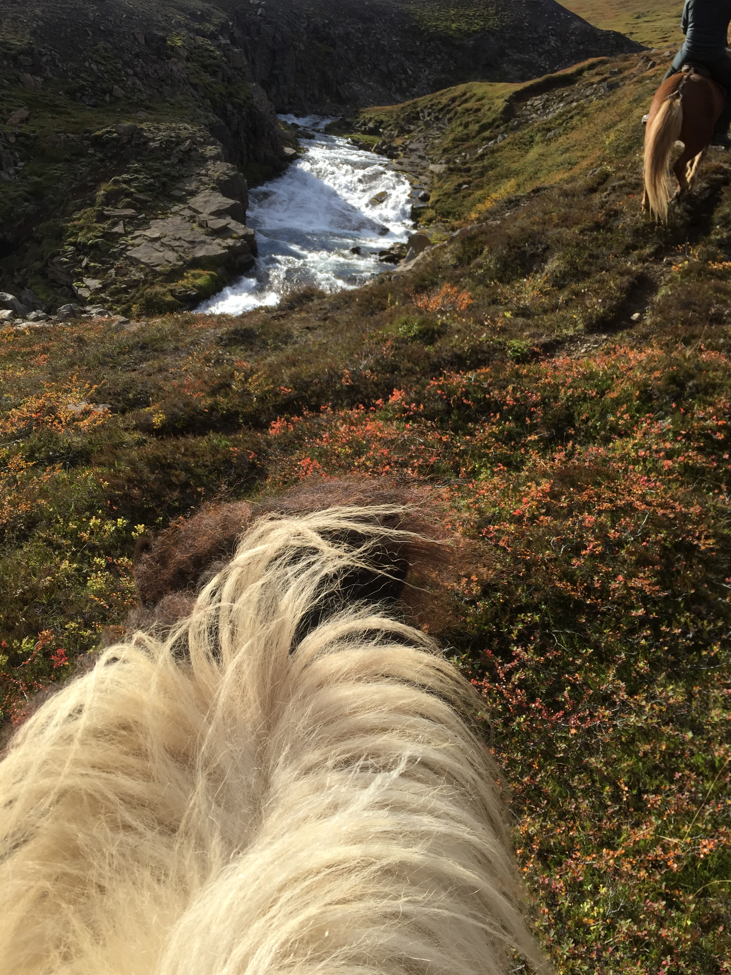 About now I would like to point out that I have done some fairly wild riding, galloped across the Namibian desert with horses falling in quicksand, been chased be elephants in Africa, but 2 hours on the fluffy 12h Icelandic pinto on my own chasing sheep in the mountains of Iceland was one of the most terrifying activities I have ever done. The first 1/2hr went reasonably well, my horse was just following the sheep at a good pace and we seemed to be doing ok, managed to collect a few extra sheep- and was actually feeling quietly confident…. I was focused and unconcerned about where i was going or where I had come from. And then it was as though the sheep realised they were being chased by a rookie and turned rogue….and it was game on…. we were winding along a river gorge, previously mostly on the flatish (very debatable) area above the sides of the gorge… we had already gone at quiet a pace over those weird boggy bumps- which I was quite sure most Australian horses would’ve broken a leg in. It was from this point I had one hand permanently in the mane and one of the reins. Happy the very sweet and happy Collie dog had joined me – again realising my in experience he thought it appropriate to guide me… the sheep appeared to jump off the edge of a cliff… and reasonably enough I paused… before following, Happy ran infront of me looked over the edge popped off, popped back up a few seconds later as if to say why aren’t you following?? And then off we went, over the edge…. we traversed the cliff wall, which, lets say was not vertical, but it was not a hill or slope of any recognisable form… my horse wanted to move swiftly along here- and only when I took a small pull did i realise why- we ended up on our side sliding down the side of the mountain for about 5m… I had jumped off as she had fallen… so we both slid a bit… I had a dressage whip, gave the poor horse a tap as we stopped sliding and jumped back on as the horse got traction. Her heart was pounding, as was mine. From that point, no half halts, pulls- if she said no to where I pointed her- I completely concurred. Up and down the gorge through bog, massively steep areas of mud we went, jumping down 3* crevasses from a stand still, across these weird open cracks which seemed incredibly deep, and it just seemed relentless, no area was nice easy footing… it felt like it was all out to kill me… I was still tailing these damn sheep… not as close as I had been as they had had less “oh shit moments”; where are the photos you ask?? At no point was I feeling secure enough to take a hand off either reins or mane to document this experience, and it wasn’t until till we had climbed down and up the ravine for the 15th time that the sheep took a particularly insane route that I finally pulled up. Realising it was about 2hrs since I had seen the others… and there was no sight of anyone anywhere, I decided to head to the highest point of the mountain and abandon my sheep who had also all split up to make my task more enjoyable -they had more chance at survival than i did!! I should say Jon had given me a walkie talkie- but I seemed to be too far out of range for it to work.. so I had no means of finding out where they were. The seemingly endless mountain which was part bog, part crater landscape- all was super mushy after an unseasonably wet summer and full of these massive crevices. The earth would just open up infront of you about every 5 meters, like huge chasms. After waiting 1/2 hr on top of mountain I set out back in the direction I had come from – and eventually saw him silhouetted on a ridge line a long long way away.On our way back down the hill we came across a couple more sheep, which we managed to drive down to the neighbouring farm and into the sheep shed. Lets just say I am looking forward to eating lamb!!!!!!! These sheep had become my sworn enemy!!!