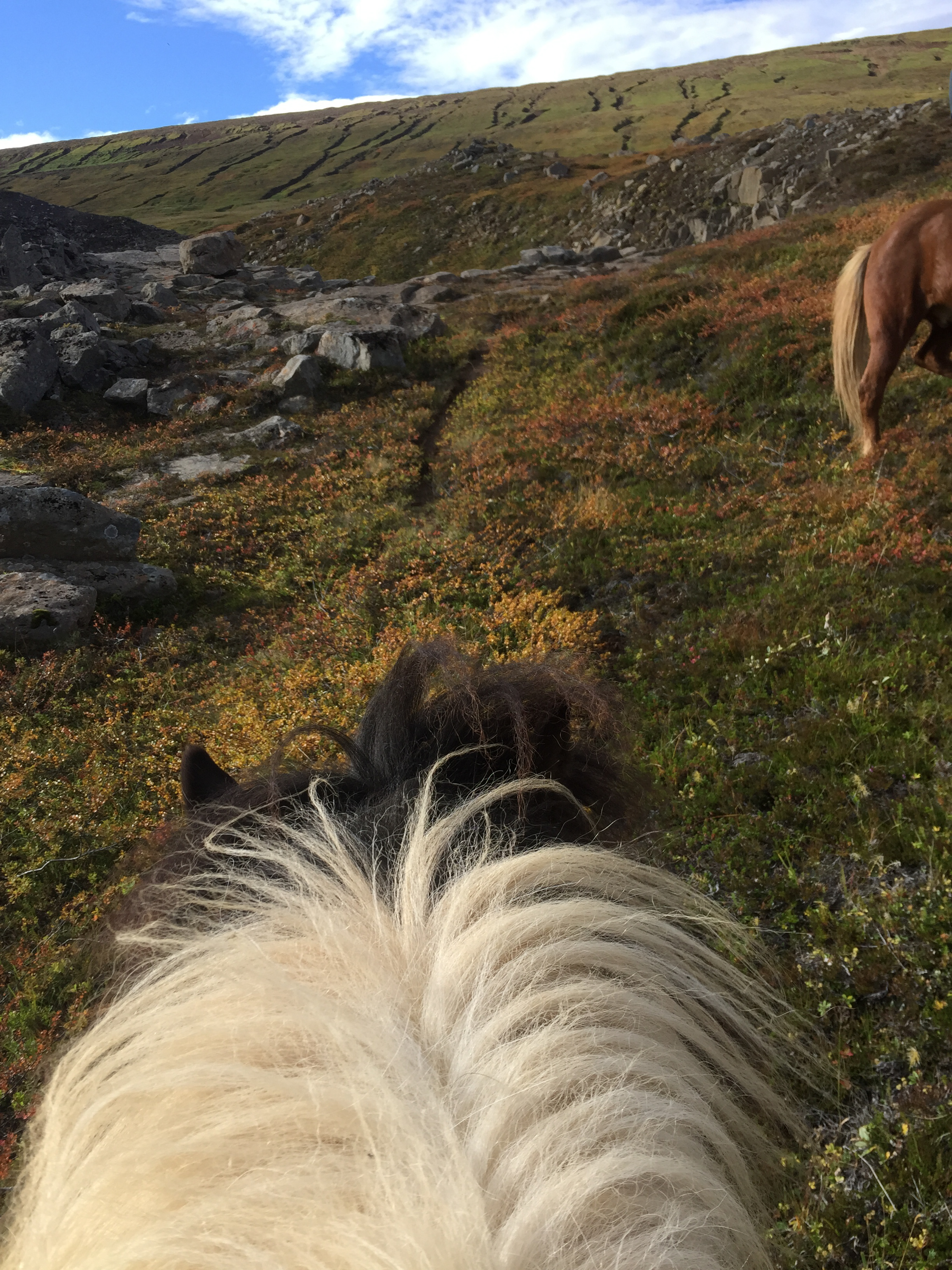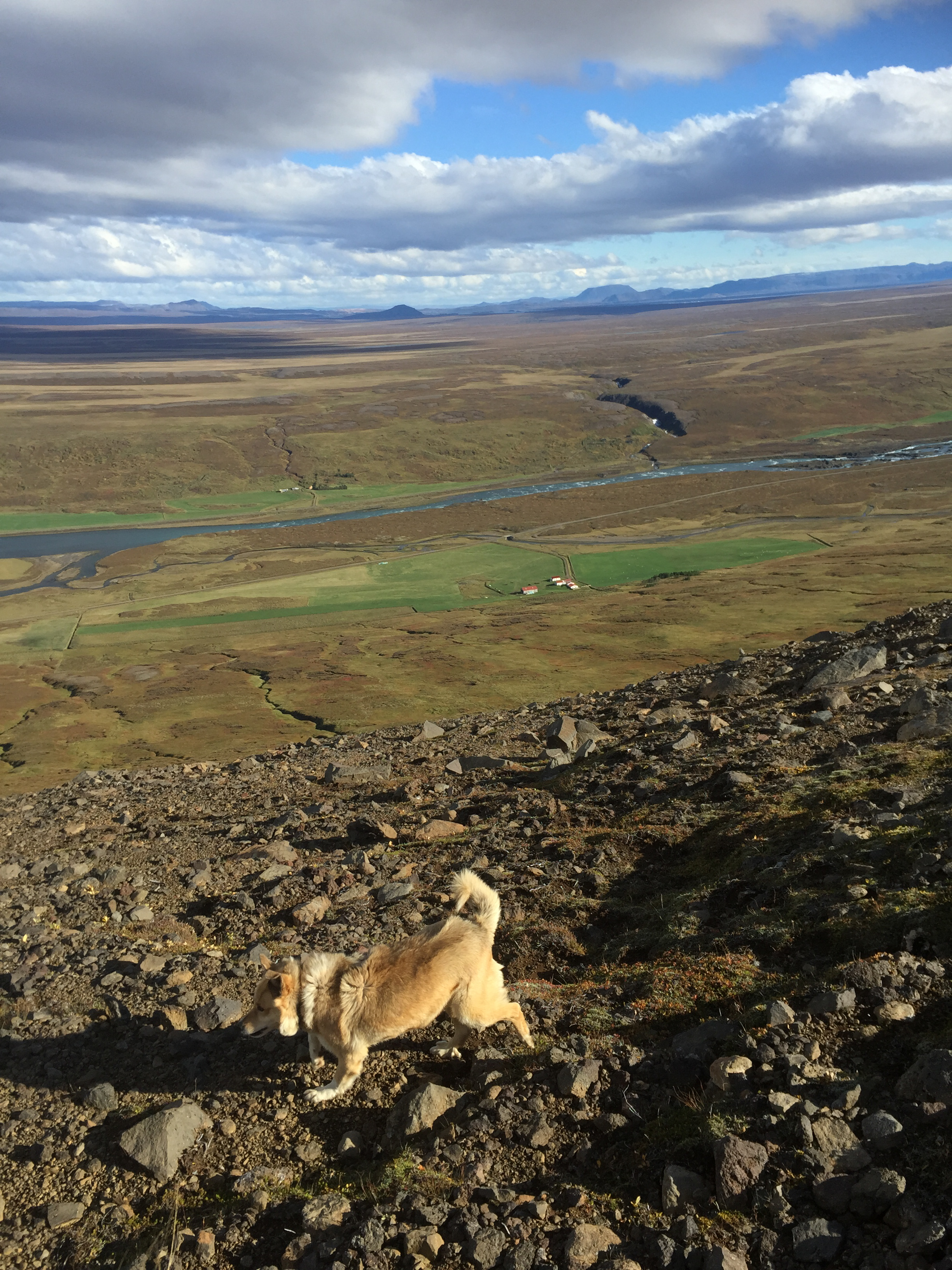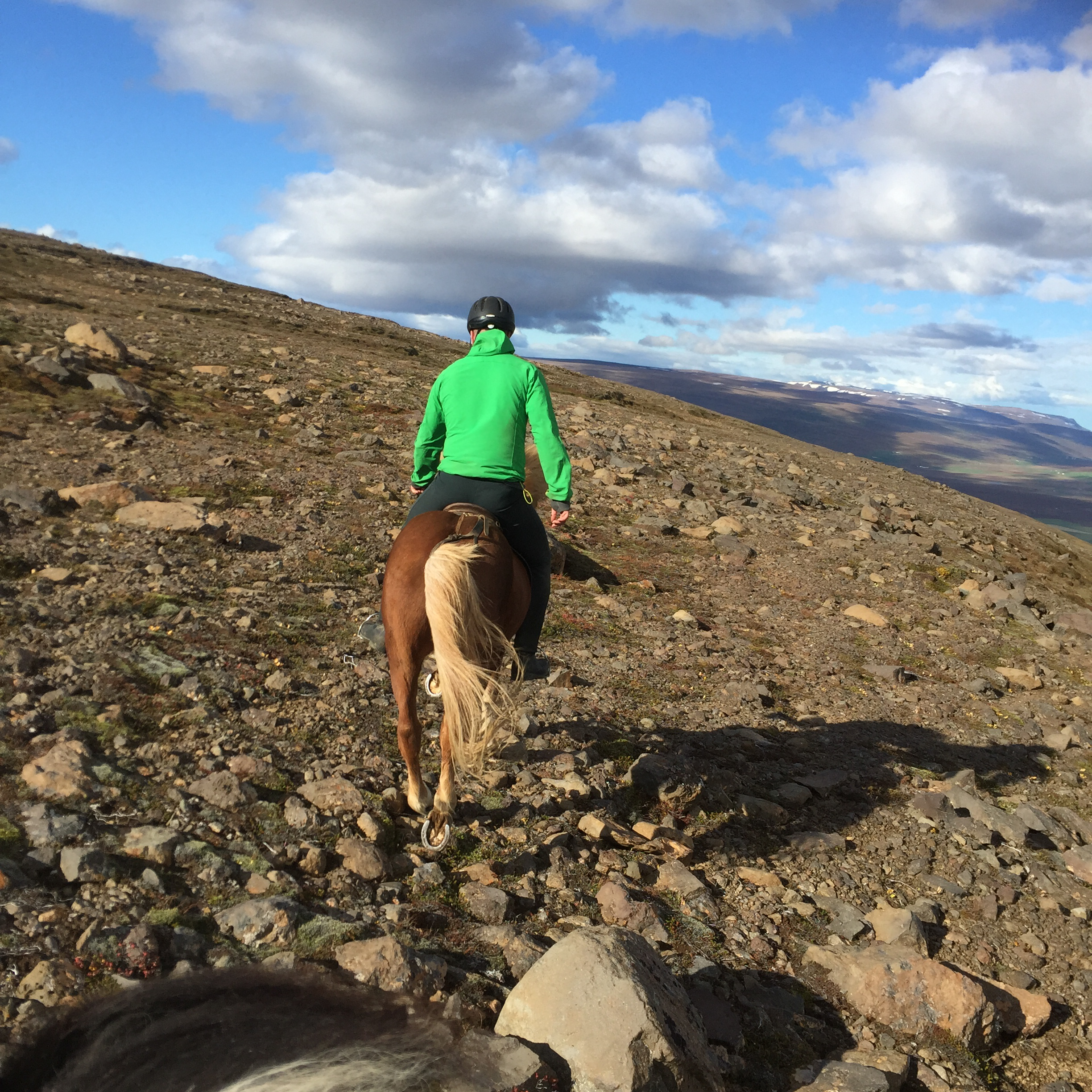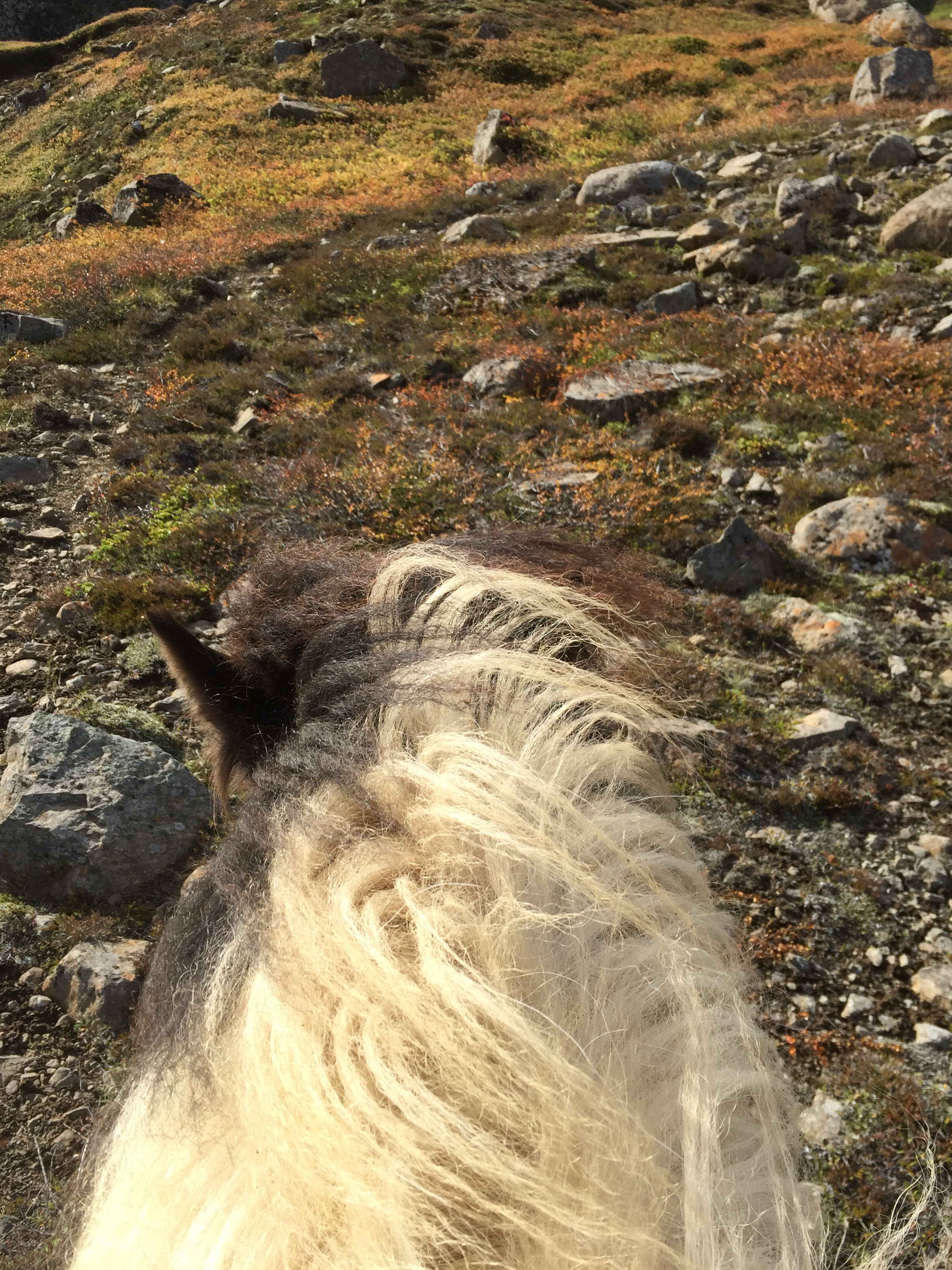 After a quick cup of tea it was action time. We were doing a 2nd round up, the main herd had been taken off the mountain and we were to collect stragglers… I thought it sounded a lovely gentle adventure… how wrong I was. We took off across the paddock and I had my first experience of the lateral gait the tölt, and started up the mountain face… not long in it was time to dismount- so we could save the horses for sheep chasing (a point I should have considered as a warning) after huffing and puffing we eventually made it up some incredibly steep terrain- all i could think about besides how out of breath I was; was if I trip over there is a long long long way to roll down!!! Perfect hangover cure- climb a mountain.