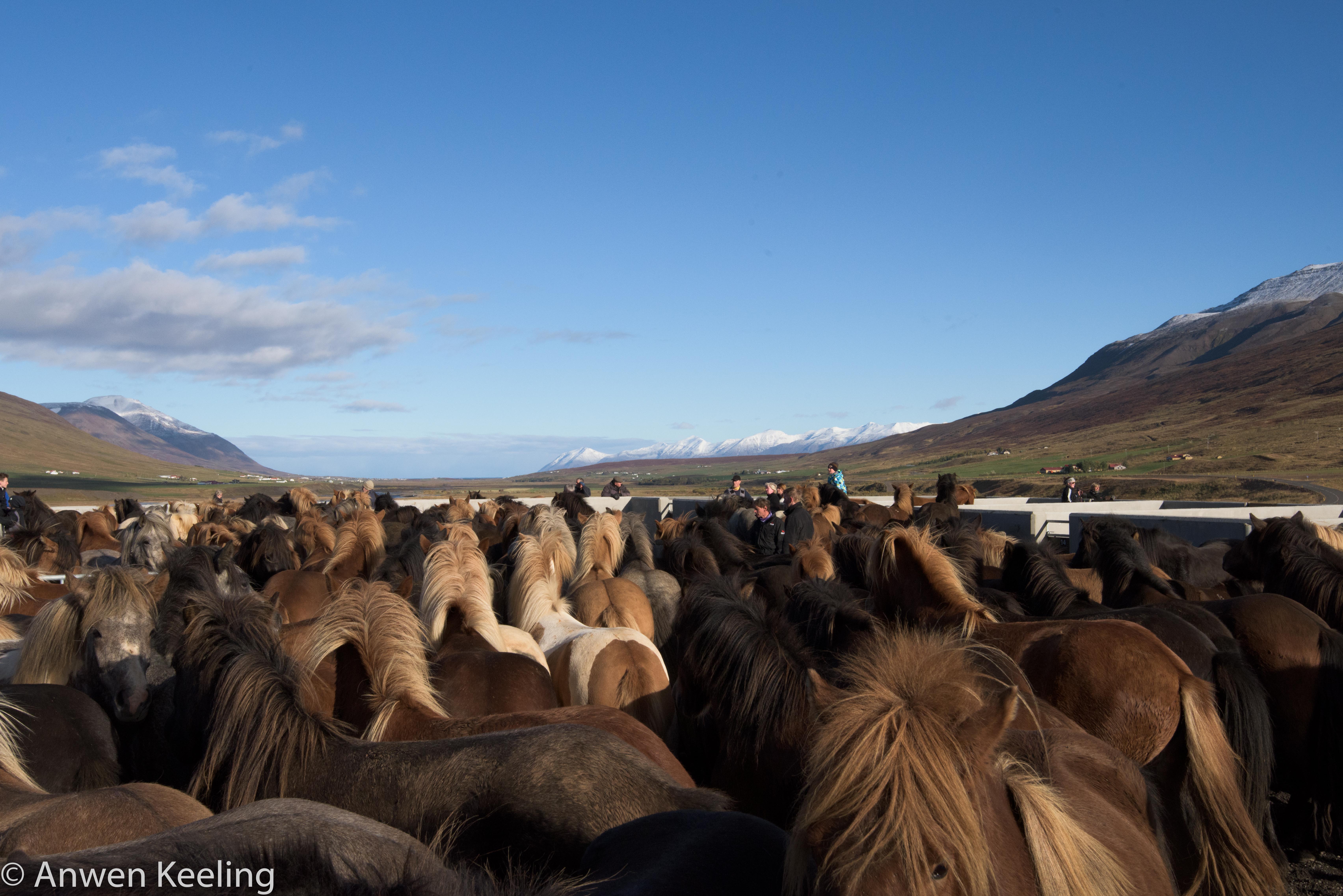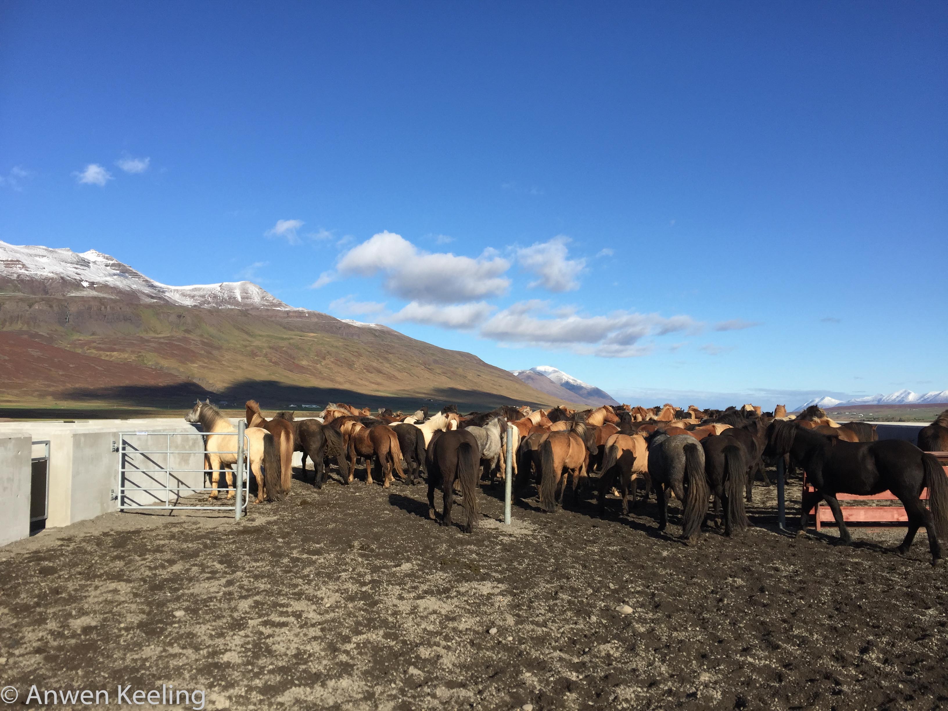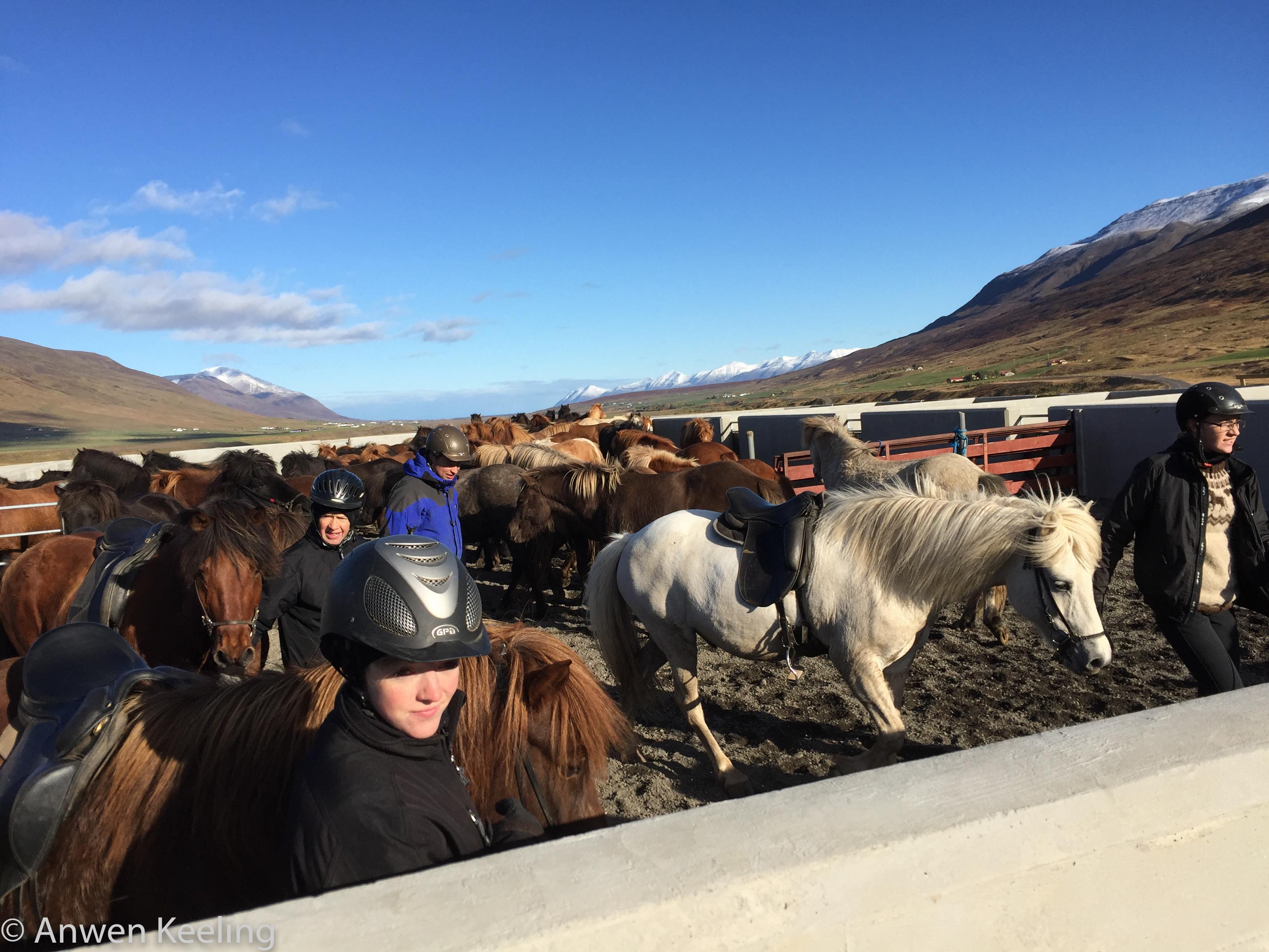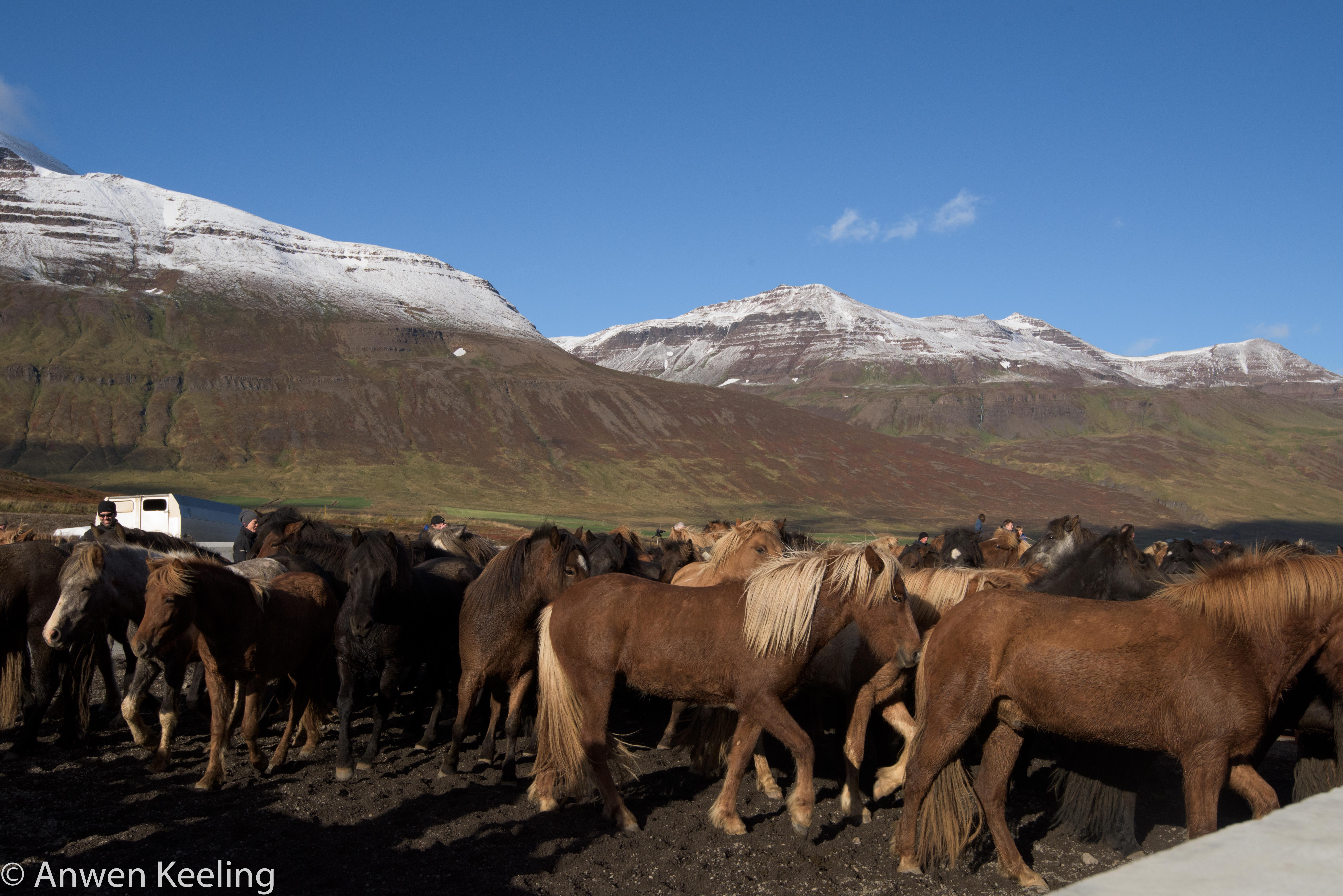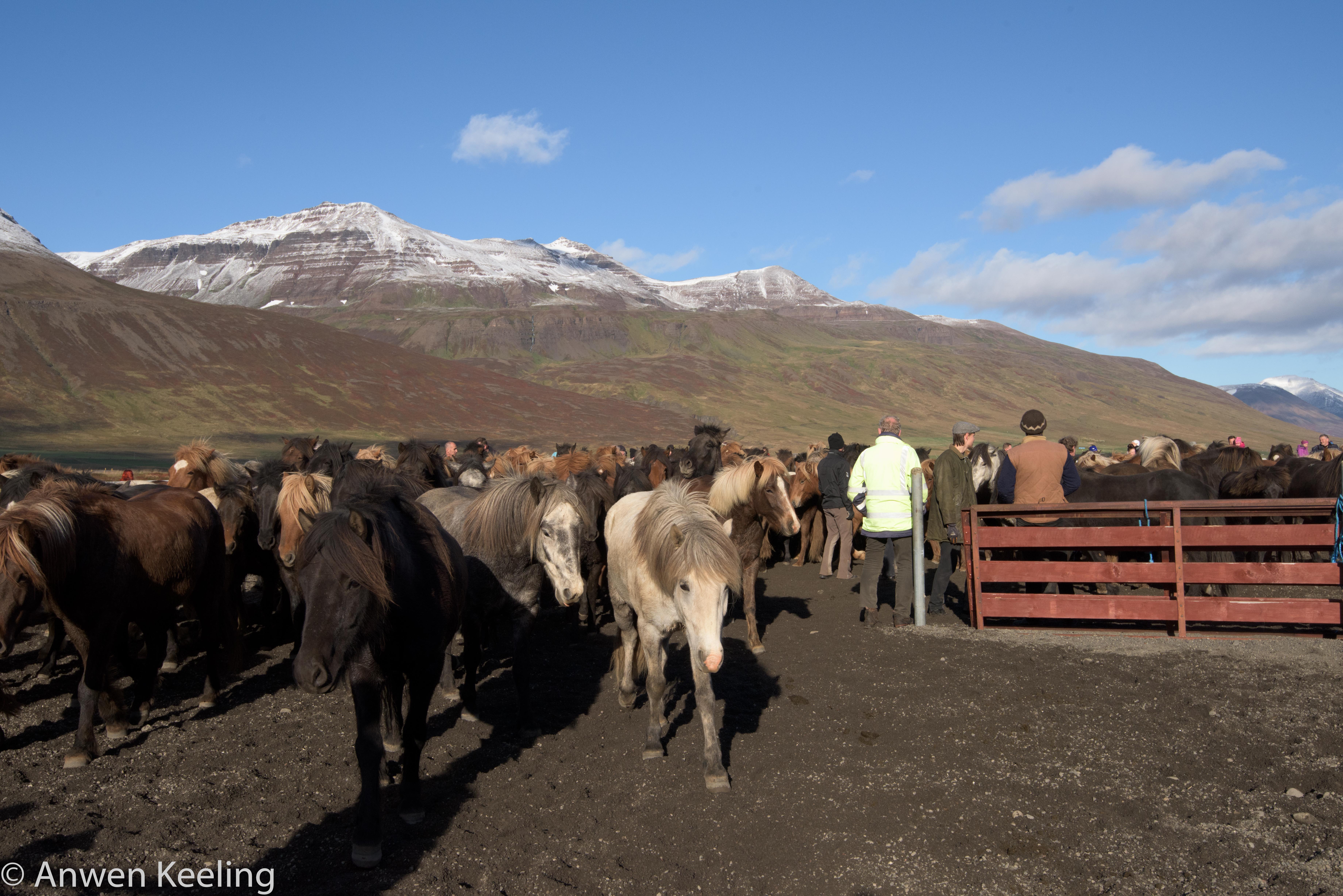 There were 134 young Icelandic horses in the holding pen awaiting the run down the valley. I was assigned to the vanguard- our aim was to lead the stampede. We set out quite fast down the road before the others let the herd out who would follow… the aim was to not let the herd overtake us. My trusty little grey horse was super- keen to go and easy to sit on with his smooth type-writer gates. About 10 of us were in this front group. They seemed to use farms as marker points, and had people stationed in cars along the way blocking roads or exits up to the mountains. We had two breaks on the way where we hopped off the horses to let them get their breath back, and herded the loose horses into a partly fenced area (one fence line and the rest of us standing around holding a piece of rope as a fence). This was to give them and us a break before then next stretch. Towards the last stretch I am not sure whether all the horses knew we were approaching the sorting yards, but there was a last-ditch effort by the horses at the front to get past us, some fun riding entailed trying to cut off the racing loose horses and keep them in the herd. There were a few hundred people milling about at the yards on our arrival, so we galloped in the yards and all the horses followed, we quickly dismounted and moved to the side to let the steady stream of horses follow. Our horses flanks were heaving. Saddles were thrown to the side and all the ridden horses were released into the paddock to have a good roll and relax before stage 3 of the operation! Stage 2 being sorting of the young horses, and stage 3 was delivering them to where ever they were meant to go!
