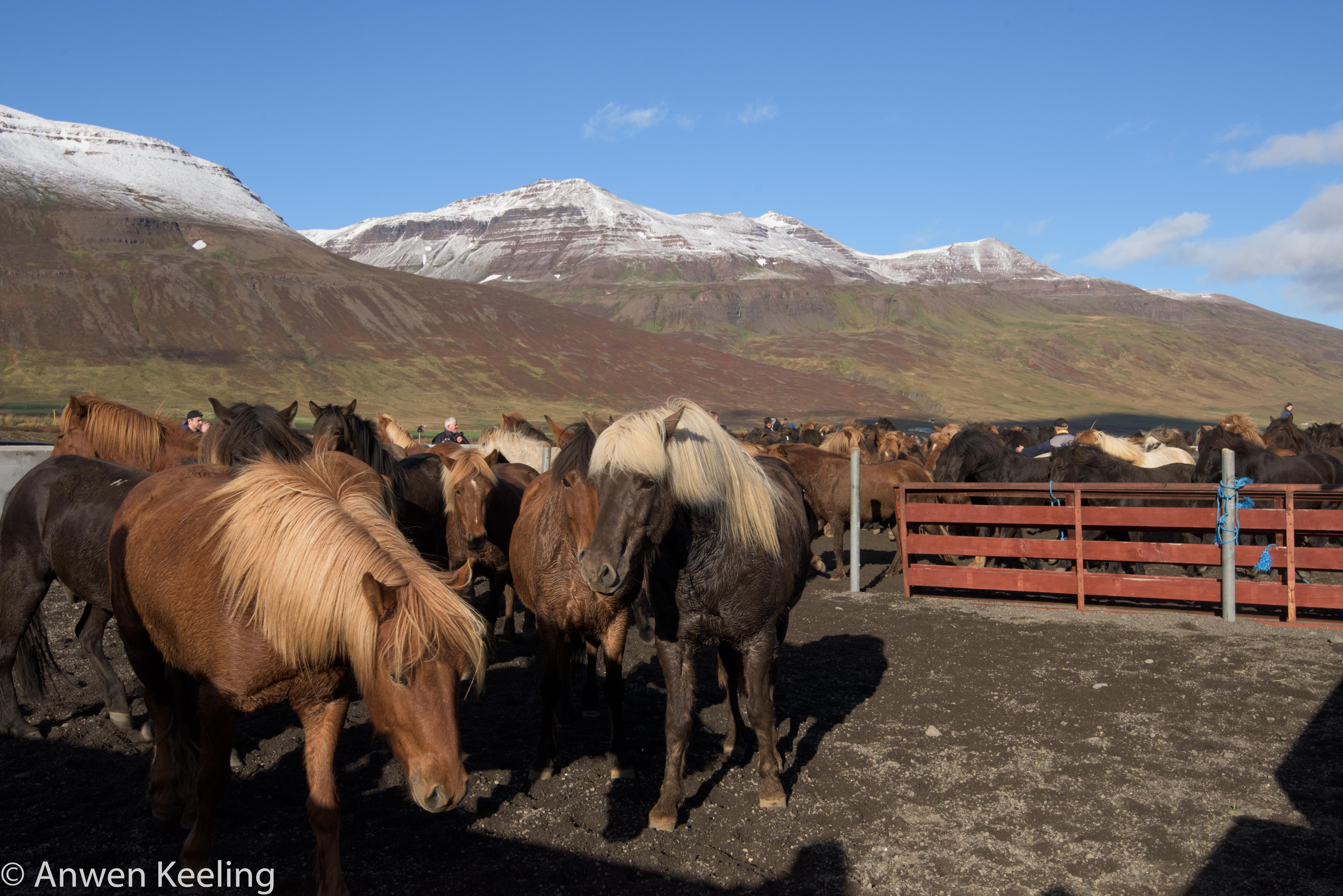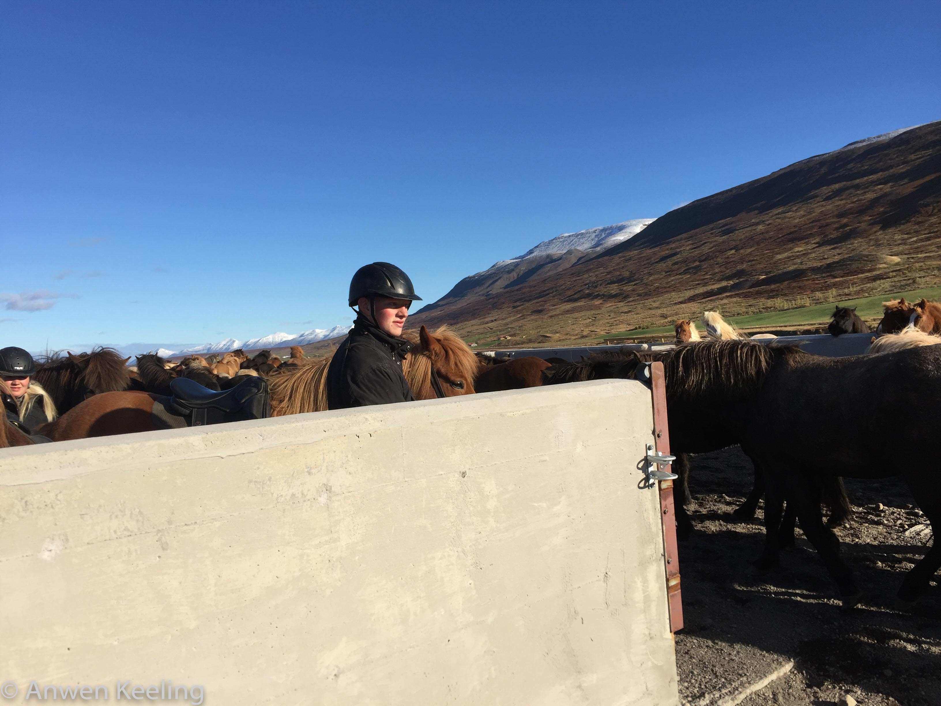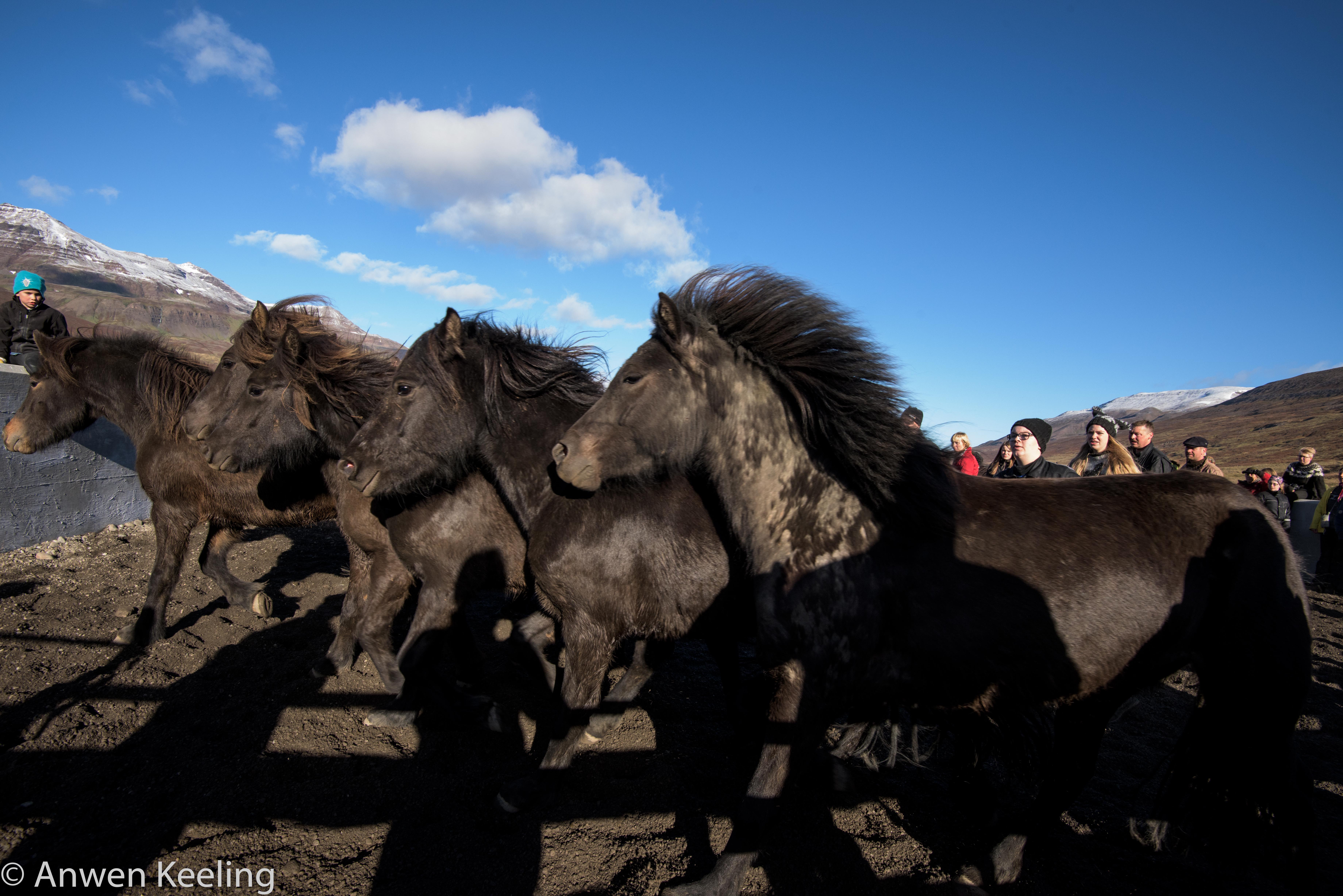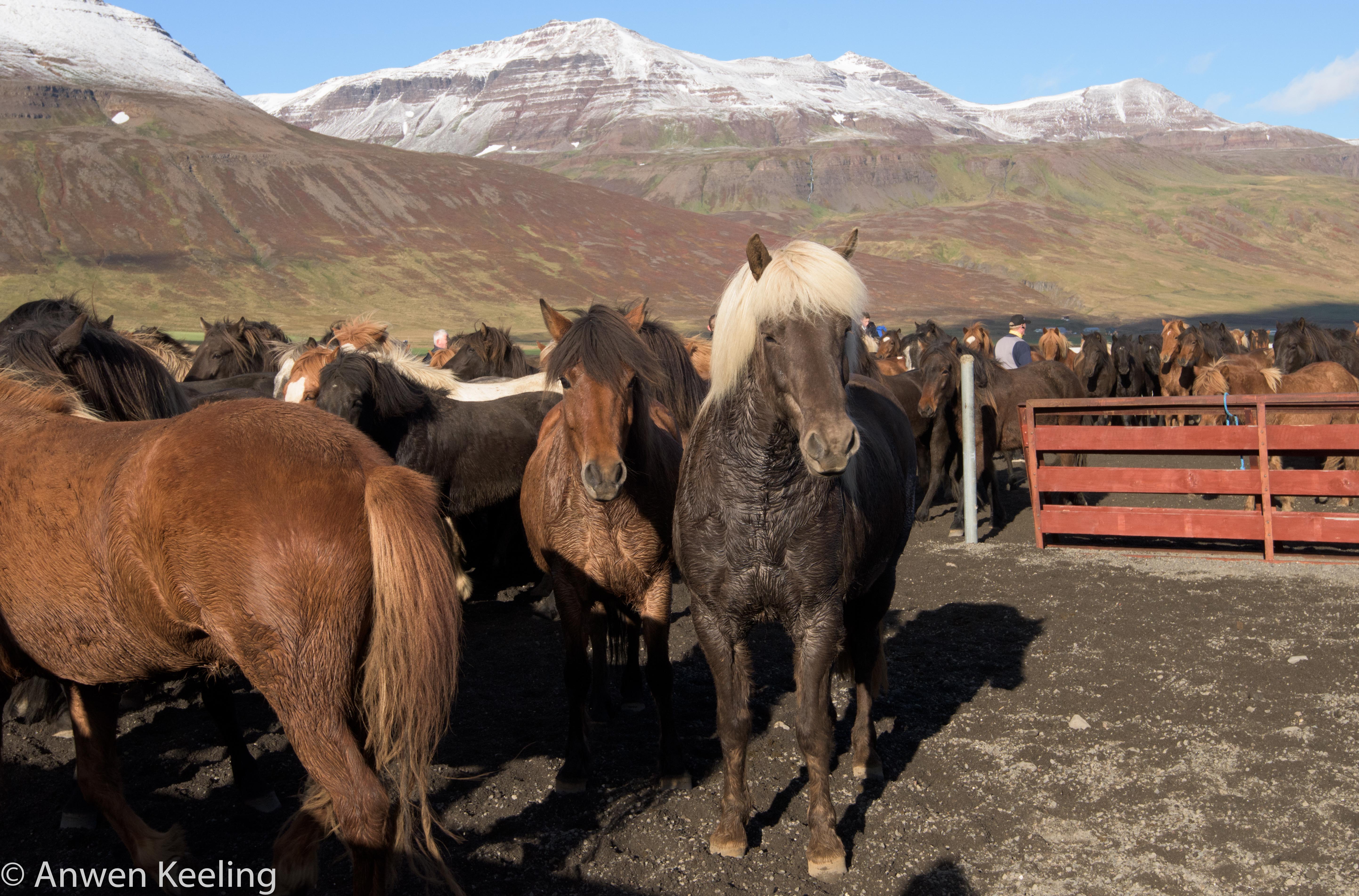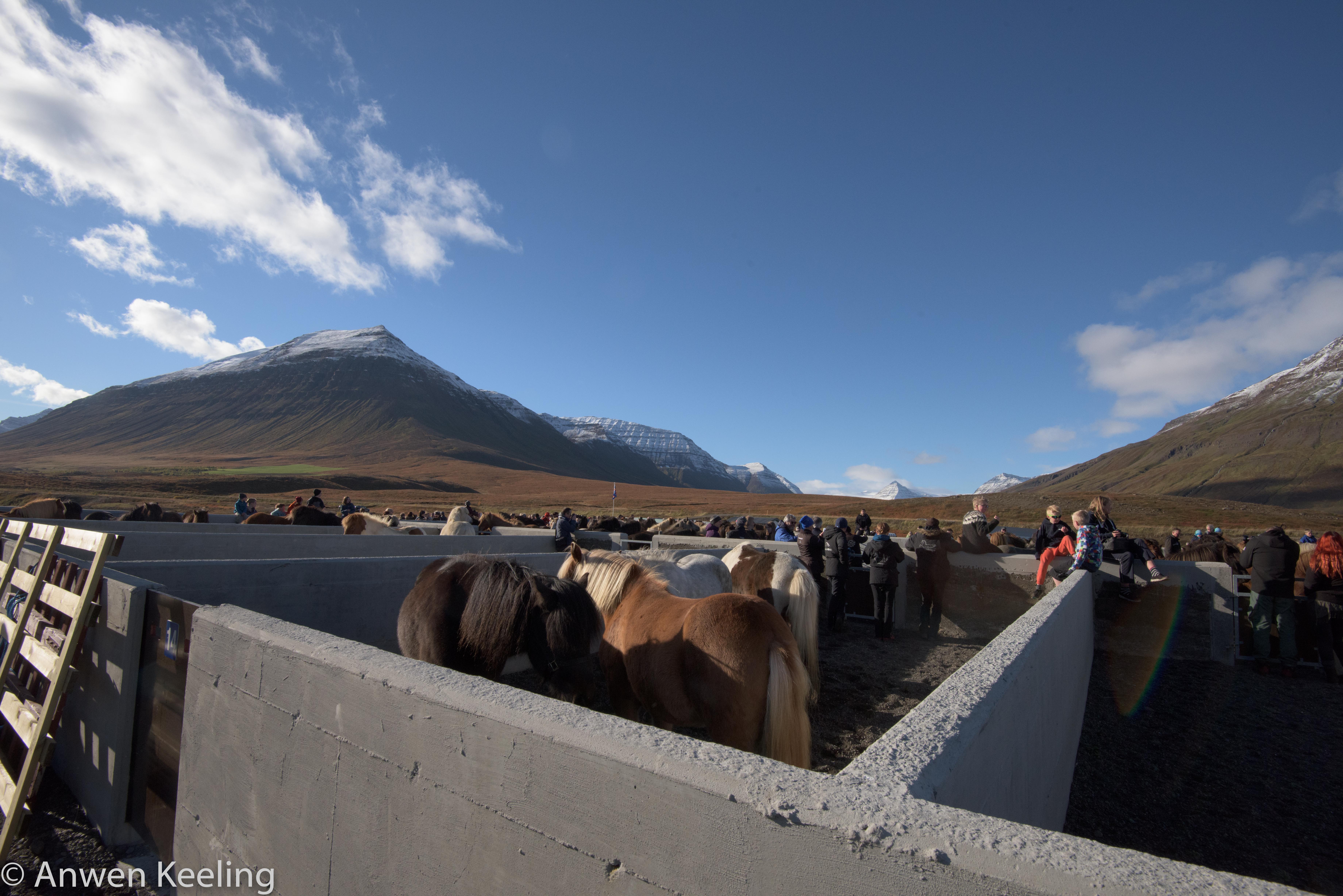 There were 134 young Icelandic horses in the holding pen awaiting the run down the valley. I was assigned to the vanguard- our aim was to lead the stampede. We set out quite fast down the road before the others let the herd out who would follow… the aim was to not let the herd overtake us. My trusty little grey horse was super- keen to go and easy to sit on with his smooth type-writer gates. About 10 of us were in this front group. They seemed to use farms as marker points, and had people stationed in cars along the way blocking roads or exits up to the mountains. We had two breaks on the way where we hopped off the horses to let them get their breath back, and herded the loose horses into a partly fenced area (one fence line and the rest of us standing around holding a piece of rope as a fence). This was to give them and us a break before then next stretch. Towards the last stretch I am not sure whether all the horses knew we were approaching the sorting yards, but there was a last-ditch effort by the horses at the front to get past us, some fun riding entailed trying to cut off the racing loose horses and keep them in the herd. There were a few hundred people milling about at the yards on our arrival, so we galloped in the yards and all the horses followed, we quickly dismounted and moved to the side to let the steady stream of horses follow. Our horses flanks were heaving. Saddles were thrown to the side and all the ridden horses were released into the paddock to have a good roll and relax before stage 3 of the operation! Stage 2 being sorting of the young horses, and stage 3 was delivering them to where ever they were meant to go!