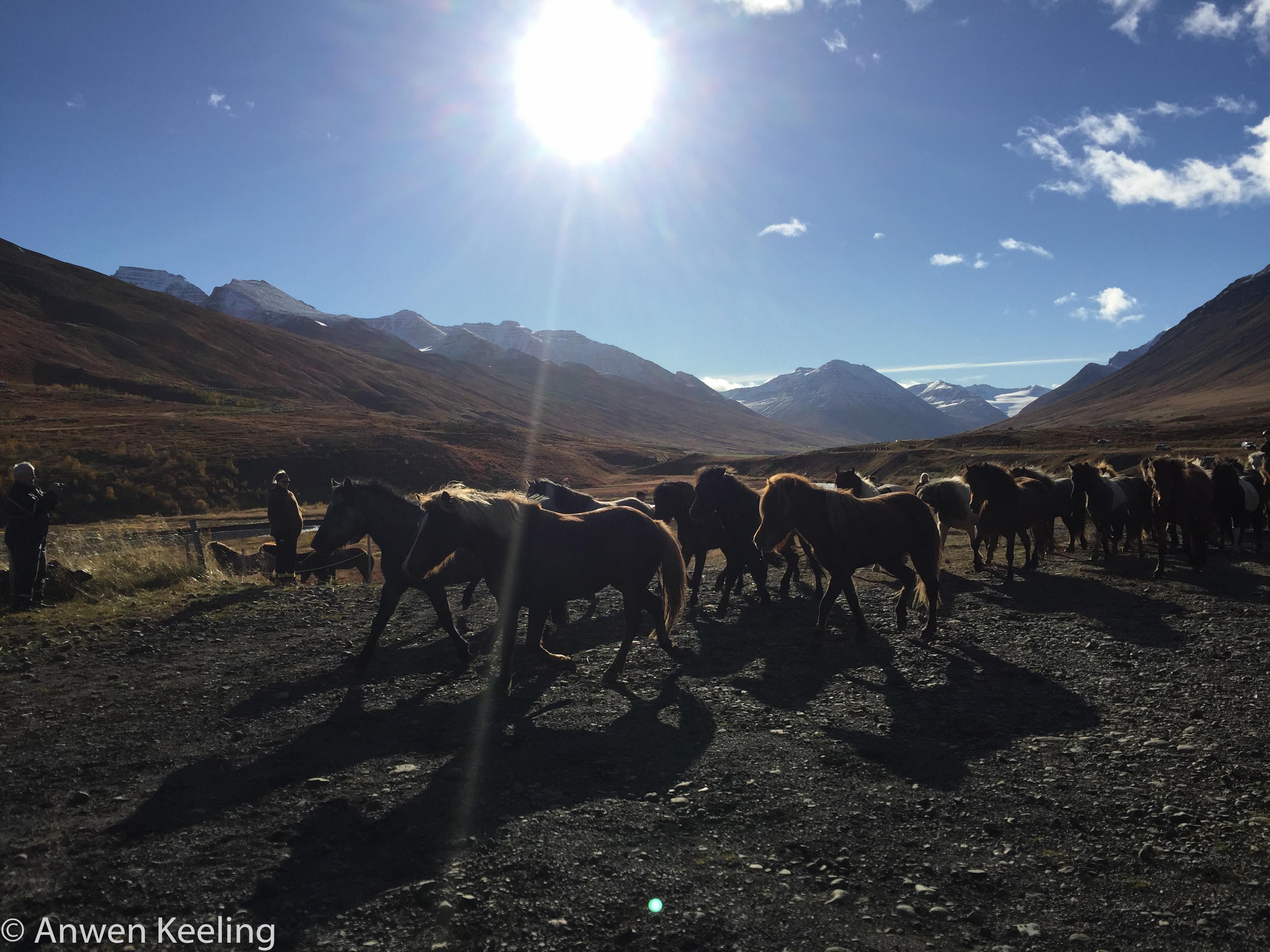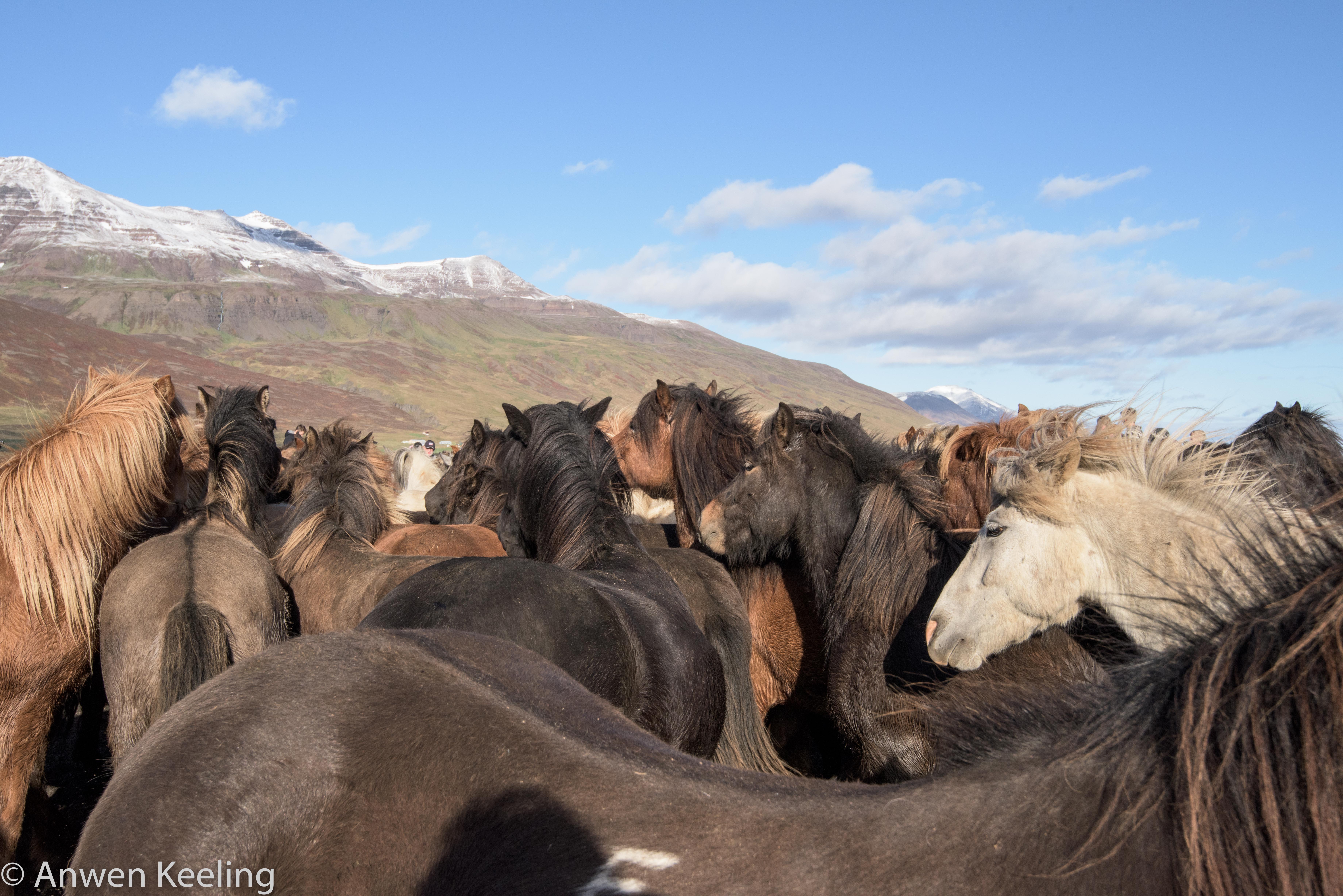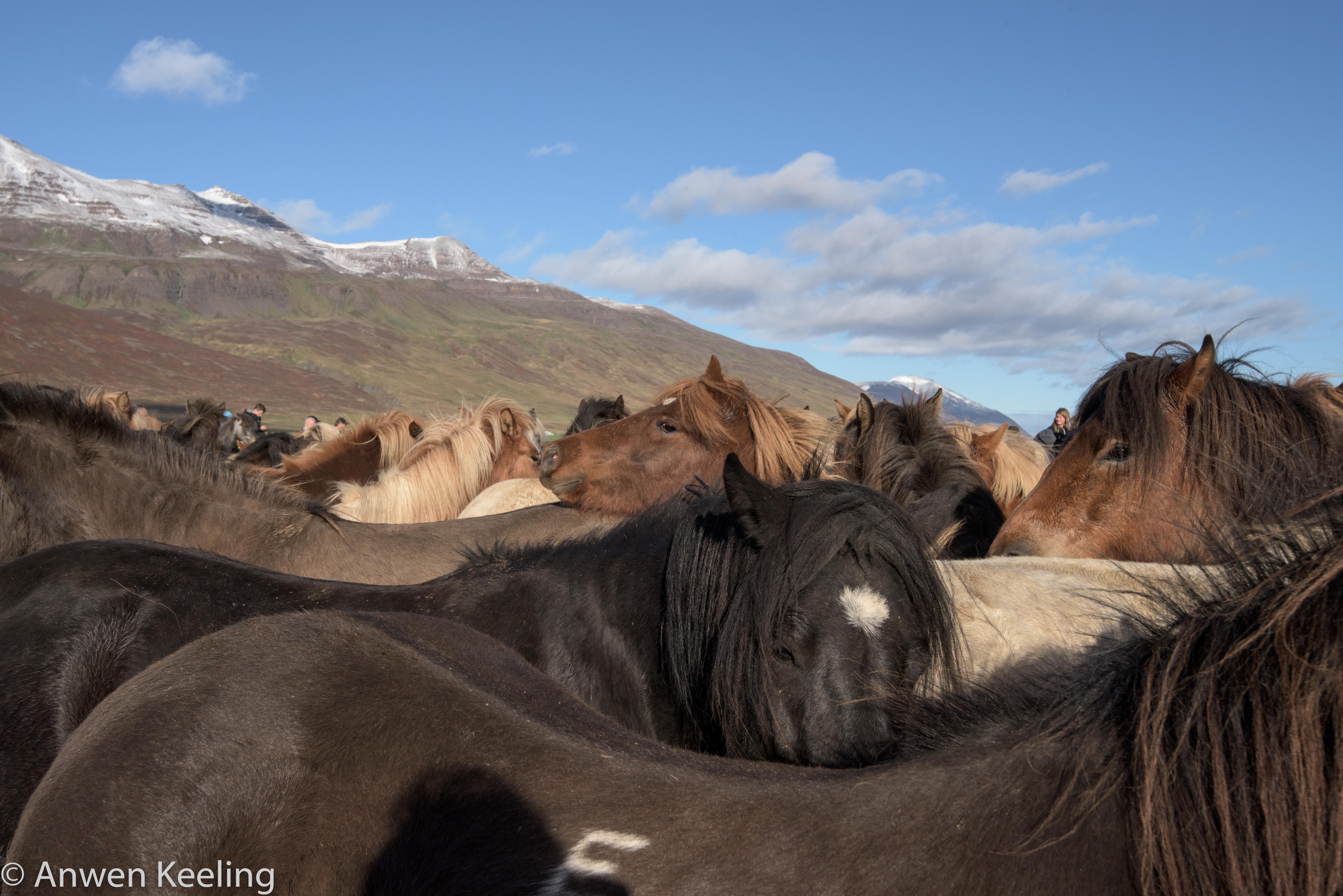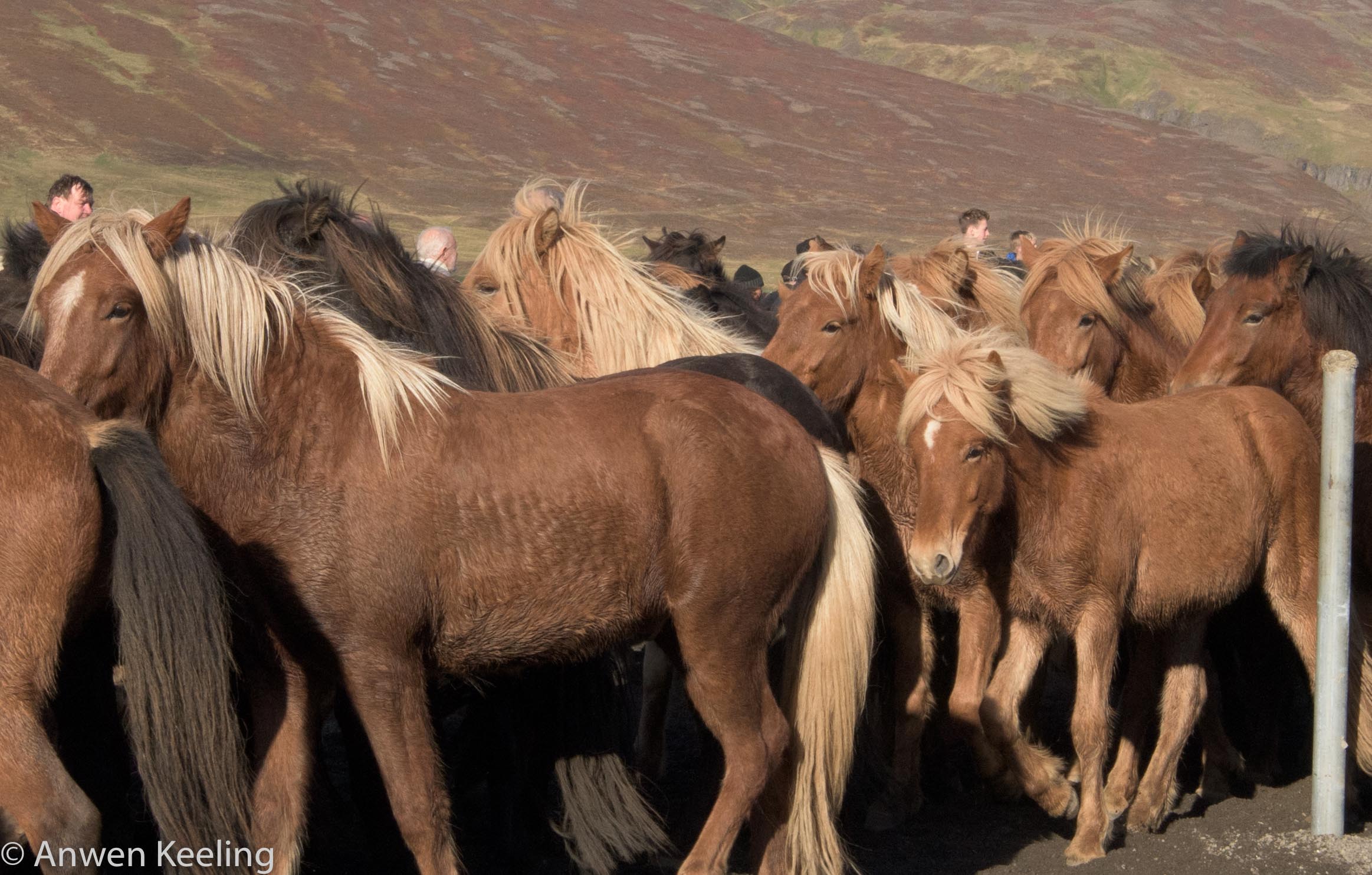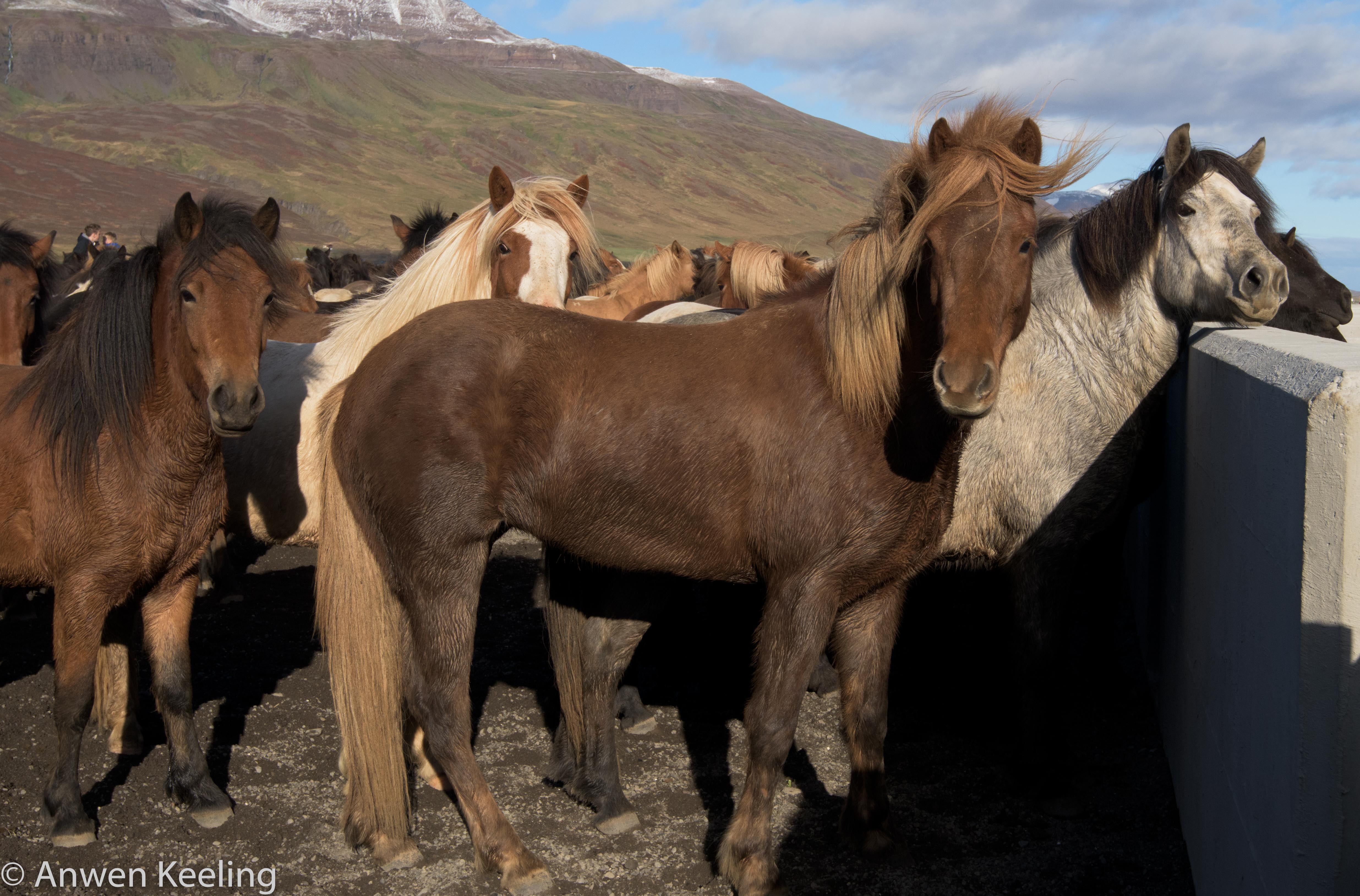 There were 134 young Icelandic horses in the holding pen awaiting the run down the valley. I was assigned to the vanguard- our aim was to lead the stampede. We set out quite fast down the road before the others let the herd out who would follow… the aim was to not let the herd overtake us. My trusty little grey horse was super- keen to go and easy to sit on with his smooth type-writer gates. About 10 of us were in this front group. They seemed to use farms as marker points, and had people stationed in cars along the way blocking roads or exits up to the mountains. We had two breaks on the way where we hopped off the horses to let them get their breath back, and herded the loose horses into a partly fenced area (one fence line and the rest of us standing around holding a piece of rope as a fence). This was to give them and us a break before then next stretch. Towards the last stretch I am not sure whether all the horses knew we were approaching the sorting yards, but there was a last-ditch effort by the horses at the front to get past us, some fun riding entailed trying to cut off the racing loose horses and keep them in the herd. There were a few hundred people milling about at the yards on our arrival, so we galloped in the yards and all the horses followed, we quickly dismounted and moved to the side to let the steady stream of horses follow. Our horses flanks were heaving. Saddles were thrown to the side and all the ridden horses were released into the paddock to have a good roll and relax before stage 3 of the operation! Stage 2 being sorting of the young horses, and stage 3 was delivering them to where ever they were meant to go!