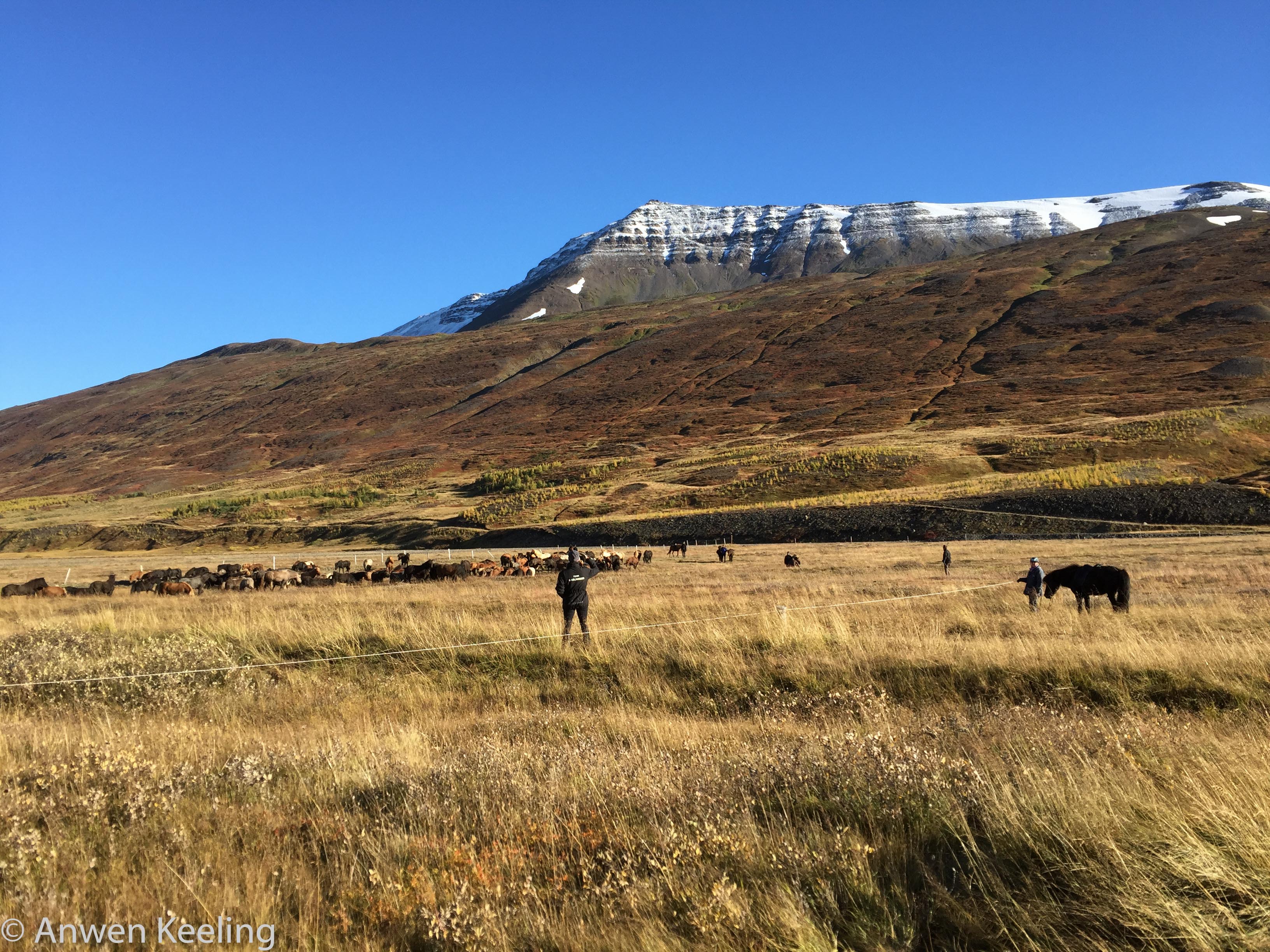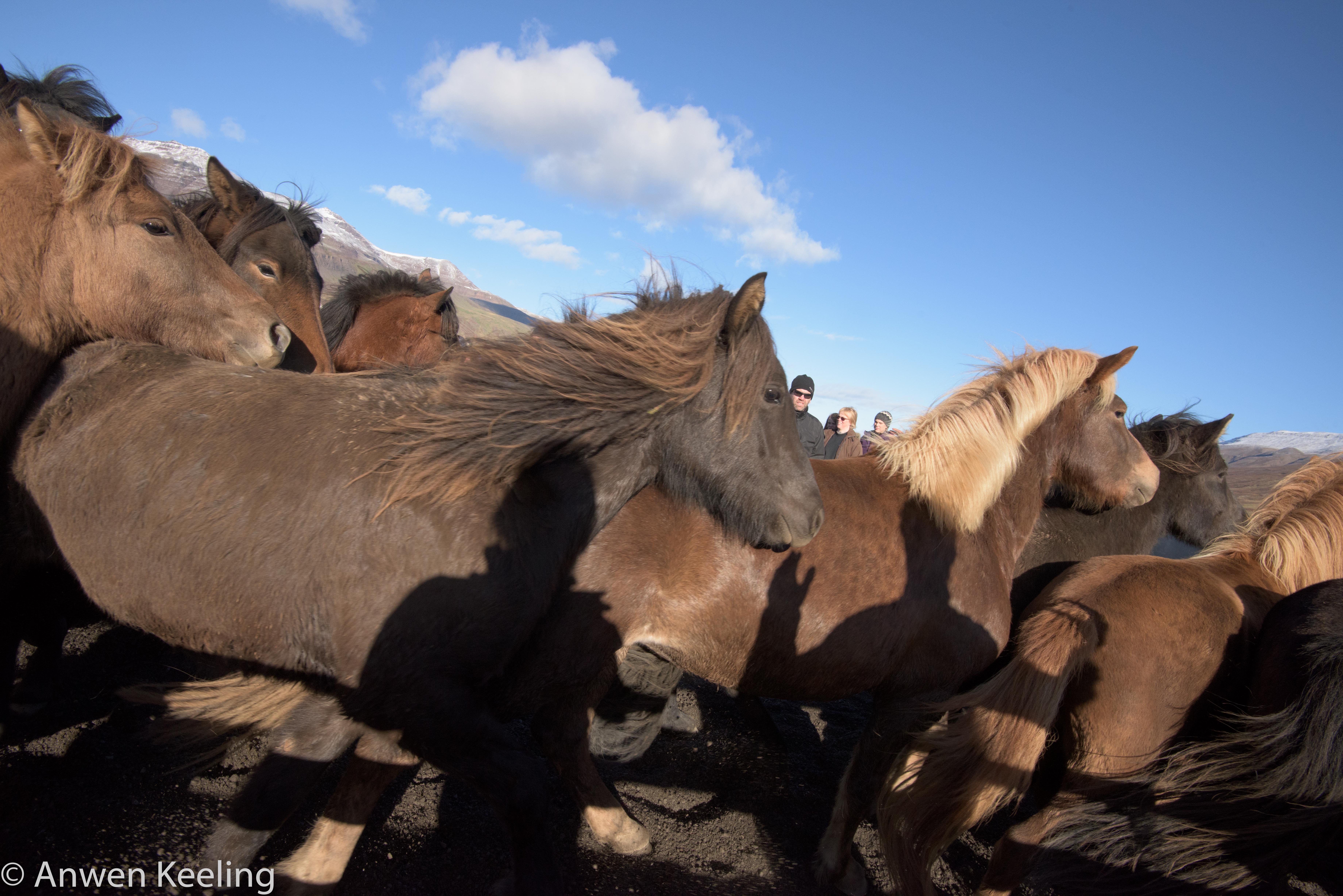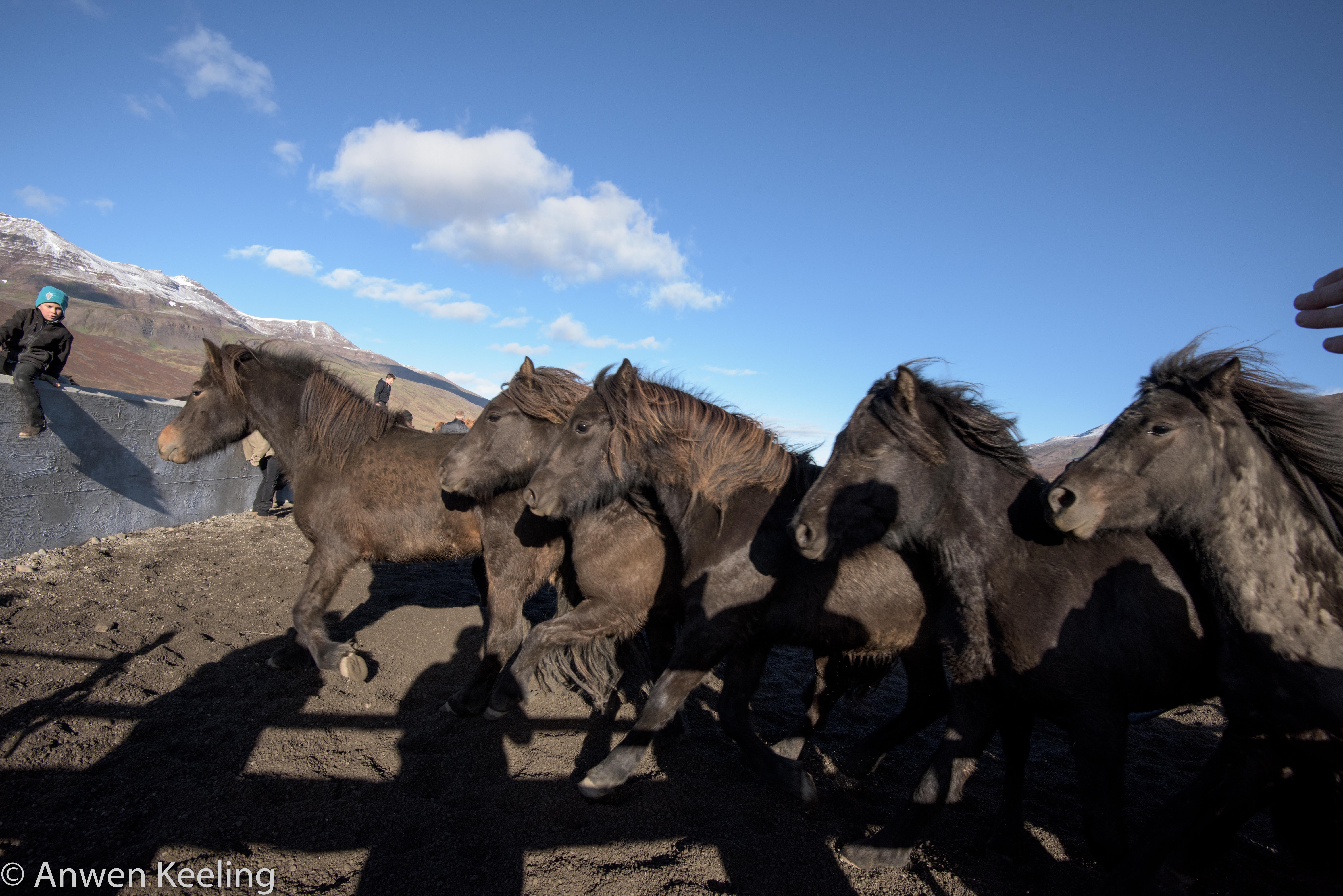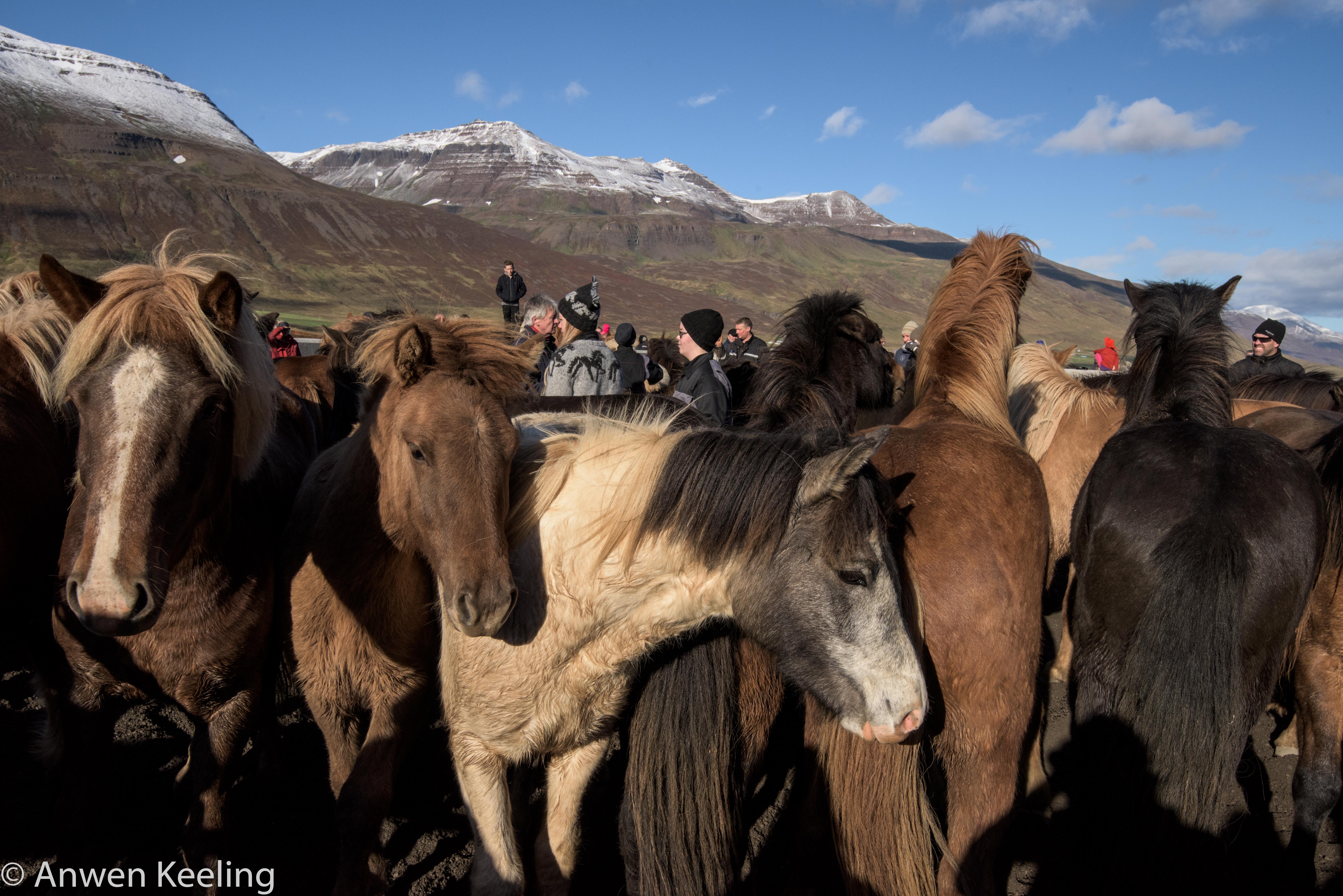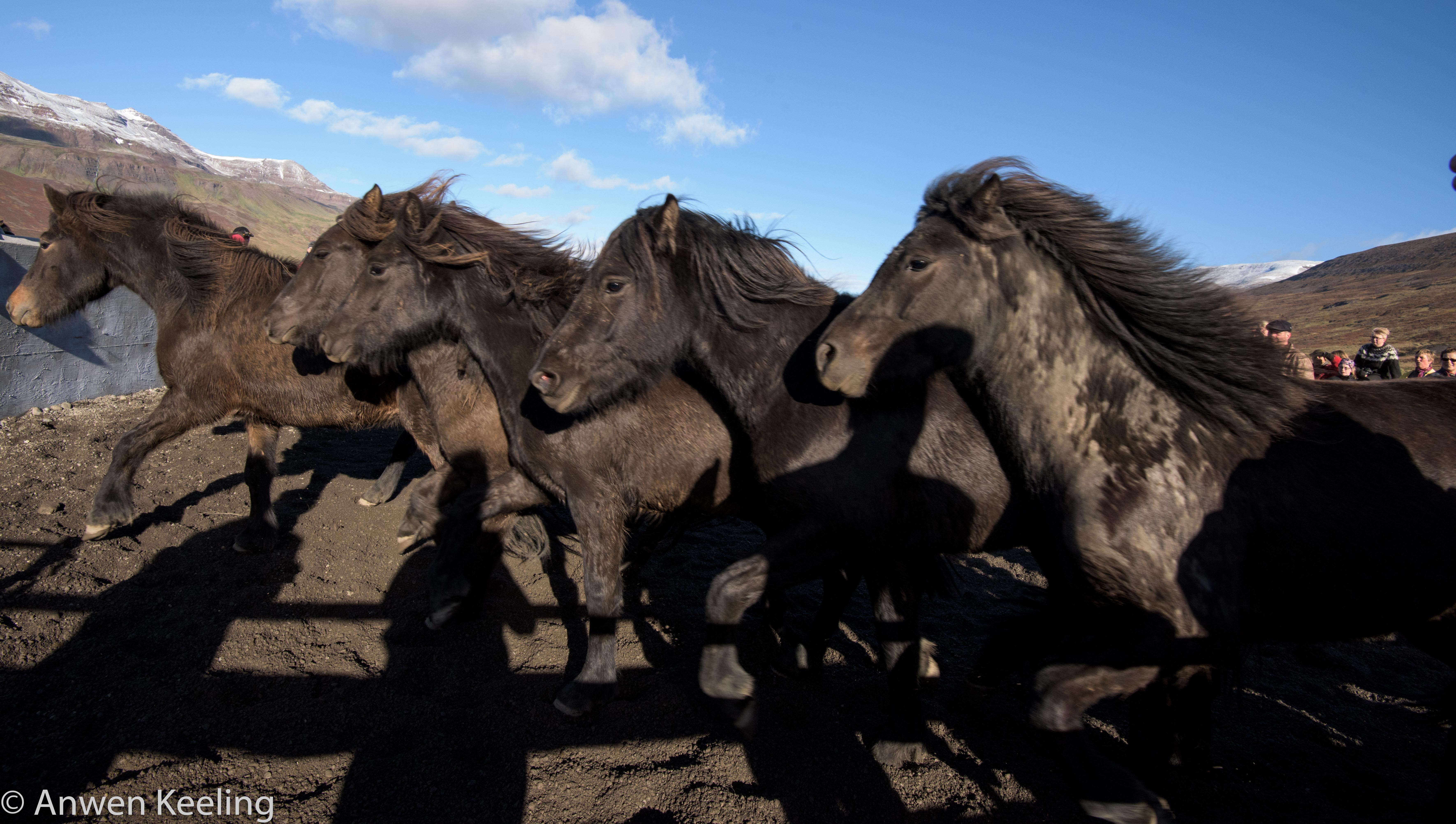There were 134 young Icelandic horses in the holding pen awaiting the run down the valley. I was assigned to the vanguard- our aim was to lead the stampede. We set out quite fast down the road before the others let the herd out who would follow… the aim was to not let the herd overtake us. My trusty little grey horse was super- keen to go and easy to sit on with his smooth type-writer gates. About 10 of us were in this front group. They seemed to use farms as marker points, and had people stationed in cars along the way blocking roads or exits up to the mountains. We had two breaks on the way where we hopped off the horses to let them get their breath back, and herded the loose horses into a partly fenced area (one fence line and the rest of us standing around holding a piece of rope as a fence). This was to give them and us a break before then next stretch. Towards the last stretch I am not sure whether all the horses knew we were approaching the sorting yards, but there was a last-ditch effort by the horses at the front to get past us, some fun riding entailed trying to cut off the racing loose horses and keep them in the herd. There were a few hundred people milling about at the yards on our arrival, so we galloped in the yards and all the horses followed, we quickly dismounted and moved to the side to let the steady stream of horses follow. Our horses flanks were heaving. Saddles were thrown to the side and all the ridden horses were released into the paddock to have a good roll and relax before stage 3 of the operation! Stage 2 being sorting of the young horses, and stage 3 was delivering them to where ever they were meant to go!