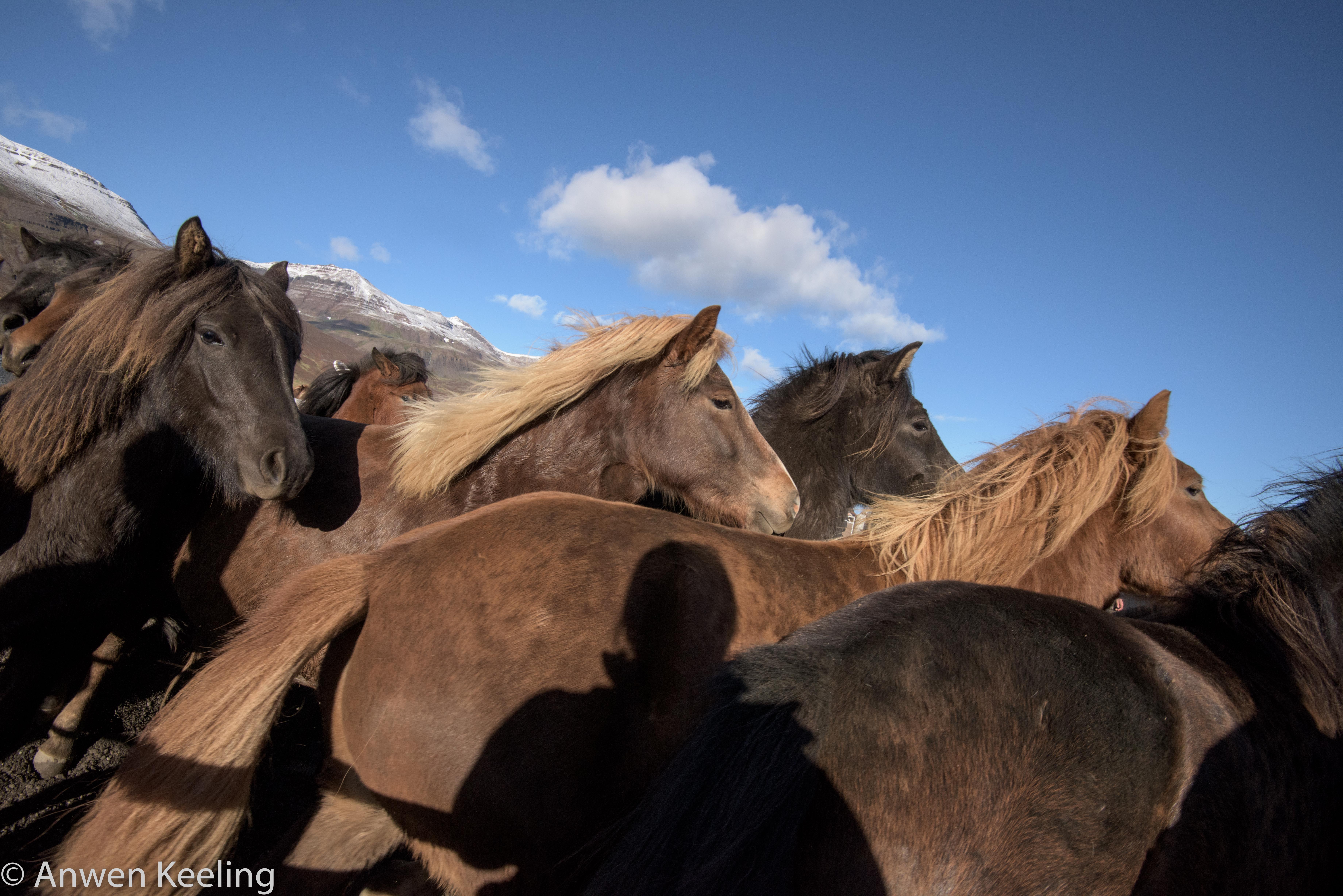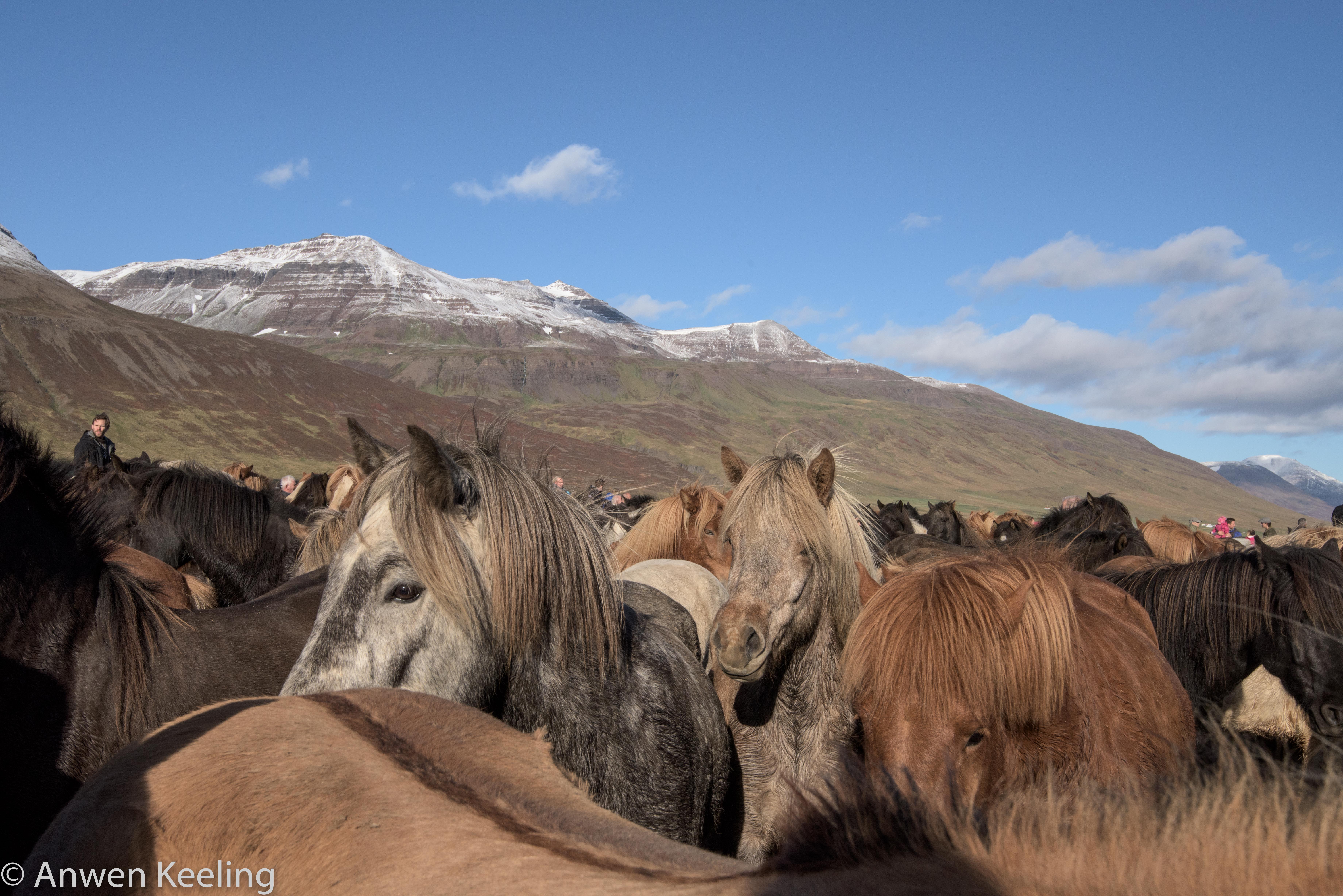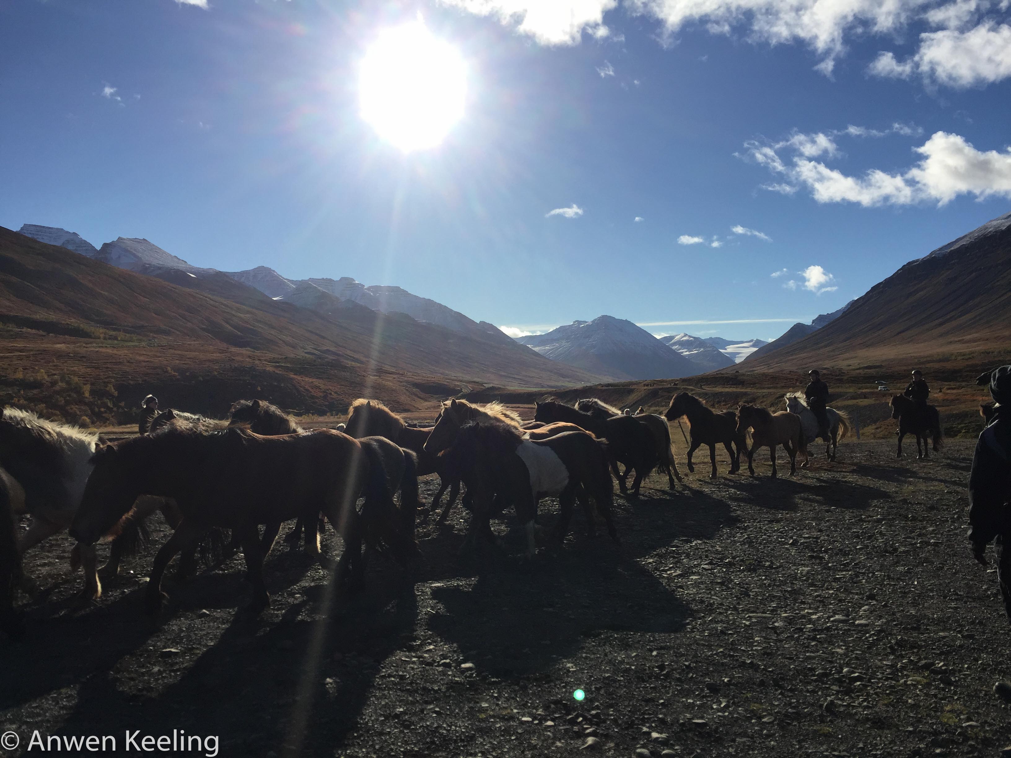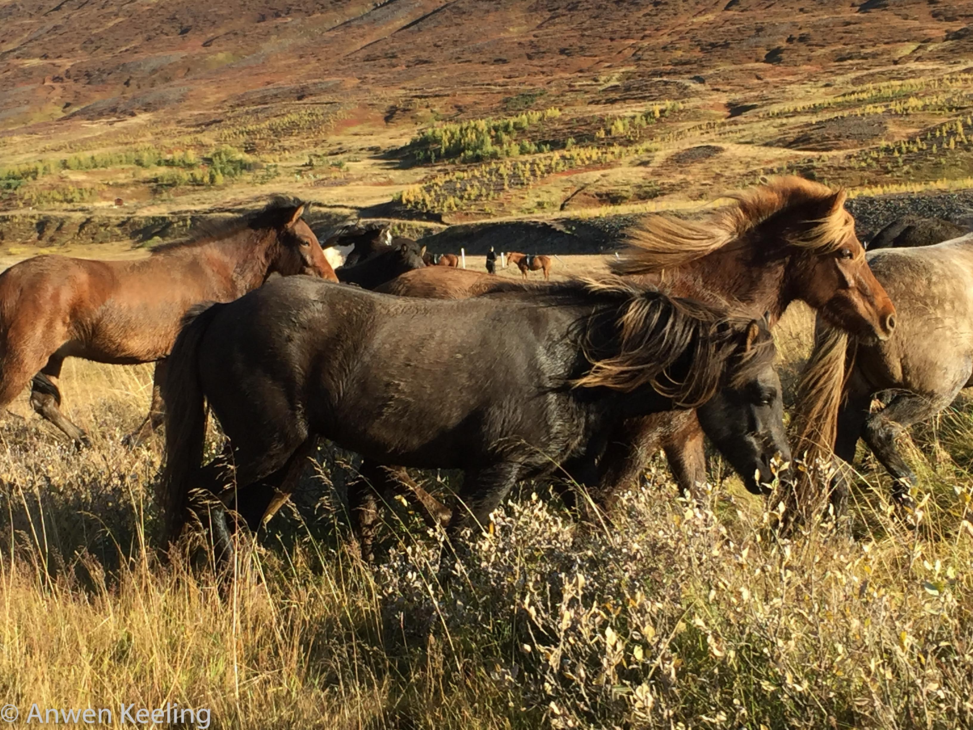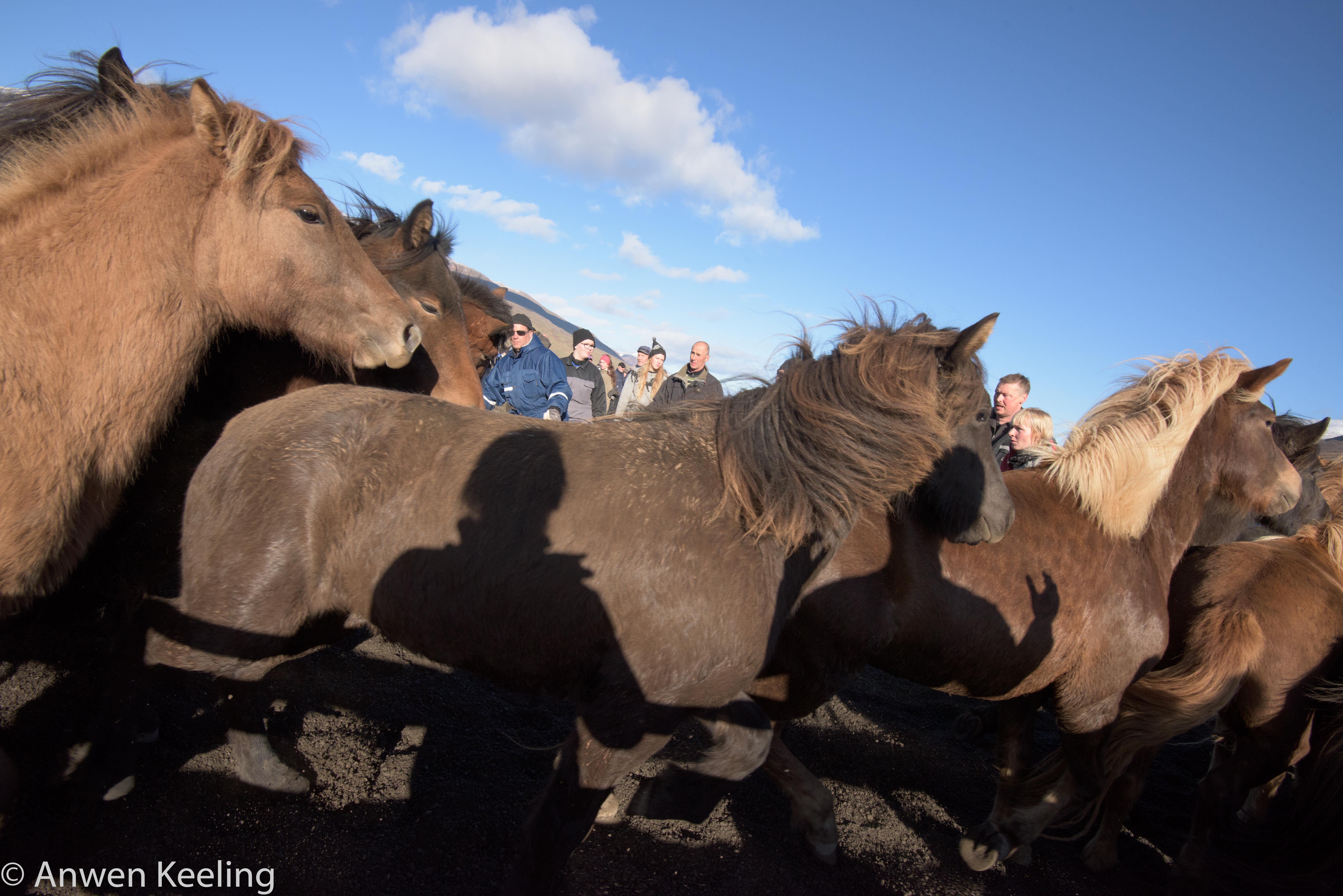 There were 134 young Icelandic horses in the holding pen awaiting the run down the valley. I was assigned to the vanguard- our aim was to lead the stampede. We set out quite fast down the road before the others let the herd out who would follow… the aim was to not let the herd overtake us. My trusty little grey horse was super- keen to go and easy to sit on with his smooth type-writer gates. About 10 of us were in this front group. They seemed to use farms as marker points, and had people stationed in cars along the way blocking roads or exits up to the mountains. We had two breaks on the way where we hopped off the horses to let them get their breath back, and herded the loose horses into a partly fenced area (one fence line and the rest of us standing around holding a piece of rope as a fence). This was to give them and us a break before then next stretch. Towards the last stretch I am not sure whether all the horses knew we were approaching the sorting yards, but there was a last-ditch effort by the horses at the front to get past us, some fun riding entailed trying to cut off the racing loose horses and keep them in the herd. There were a few hundred people milling about at the yards on our arrival, so we galloped in the yards and all the horses followed, we quickly dismounted and moved to the side to let the steady stream of horses follow. Our horses flanks were heaving. Saddles were thrown to the side and all the ridden horses were released into the paddock to have a good roll and relax before stage 3 of the operation! Stage 2 being sorting of the young horses, and stage 3 was delivering them to where ever they were meant to go!