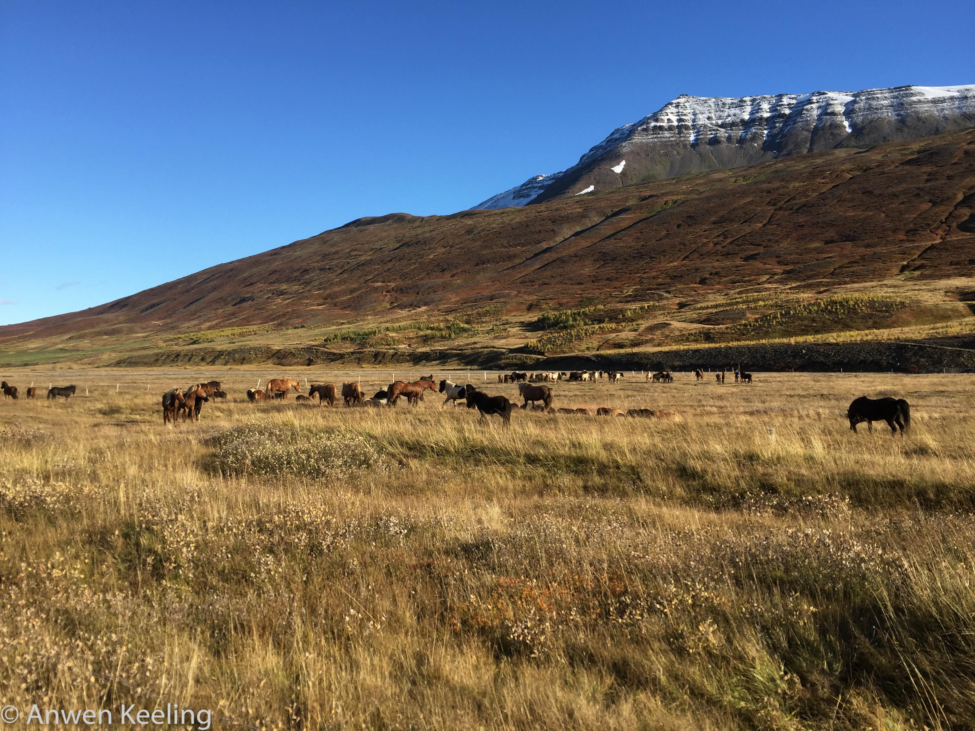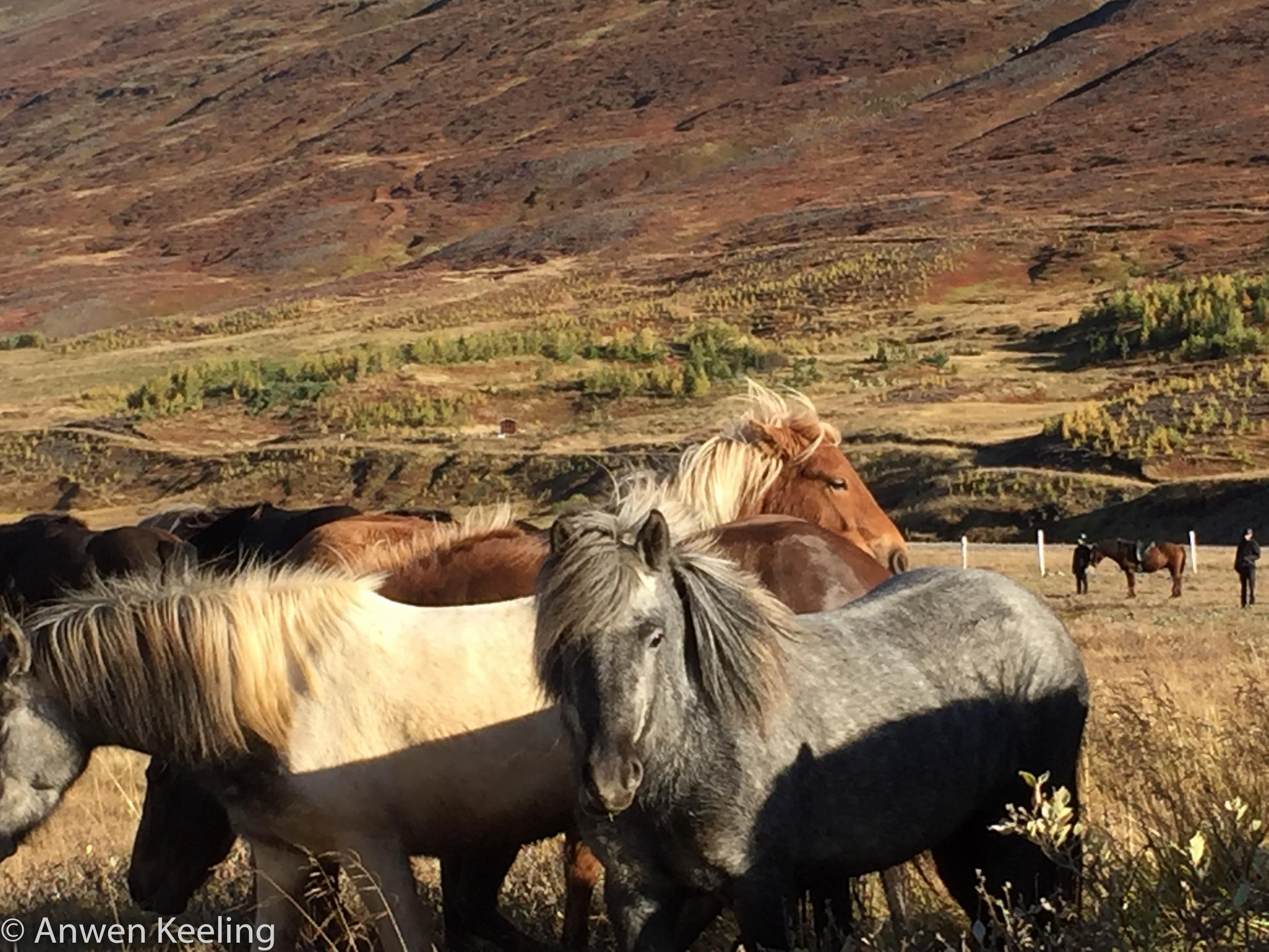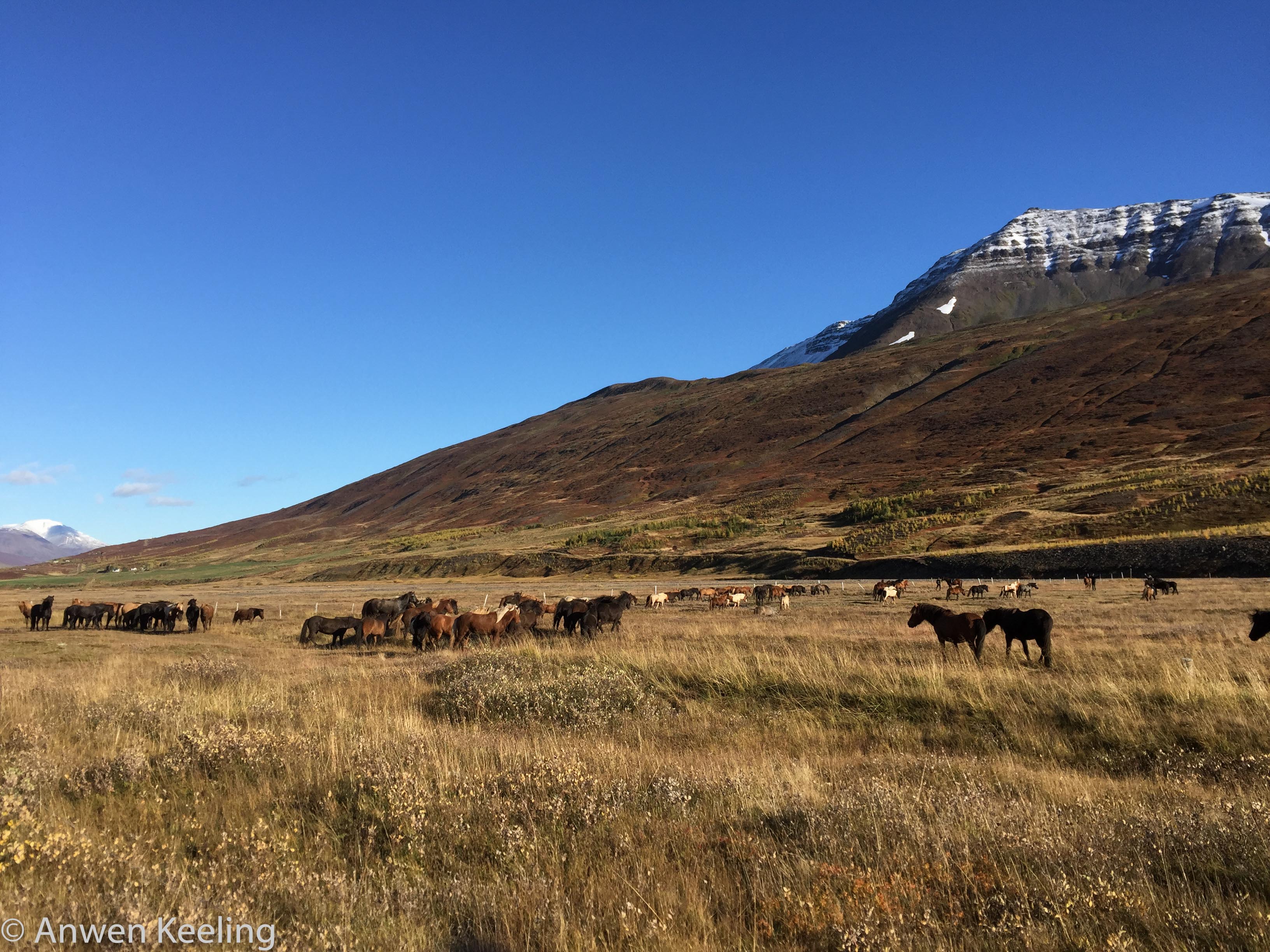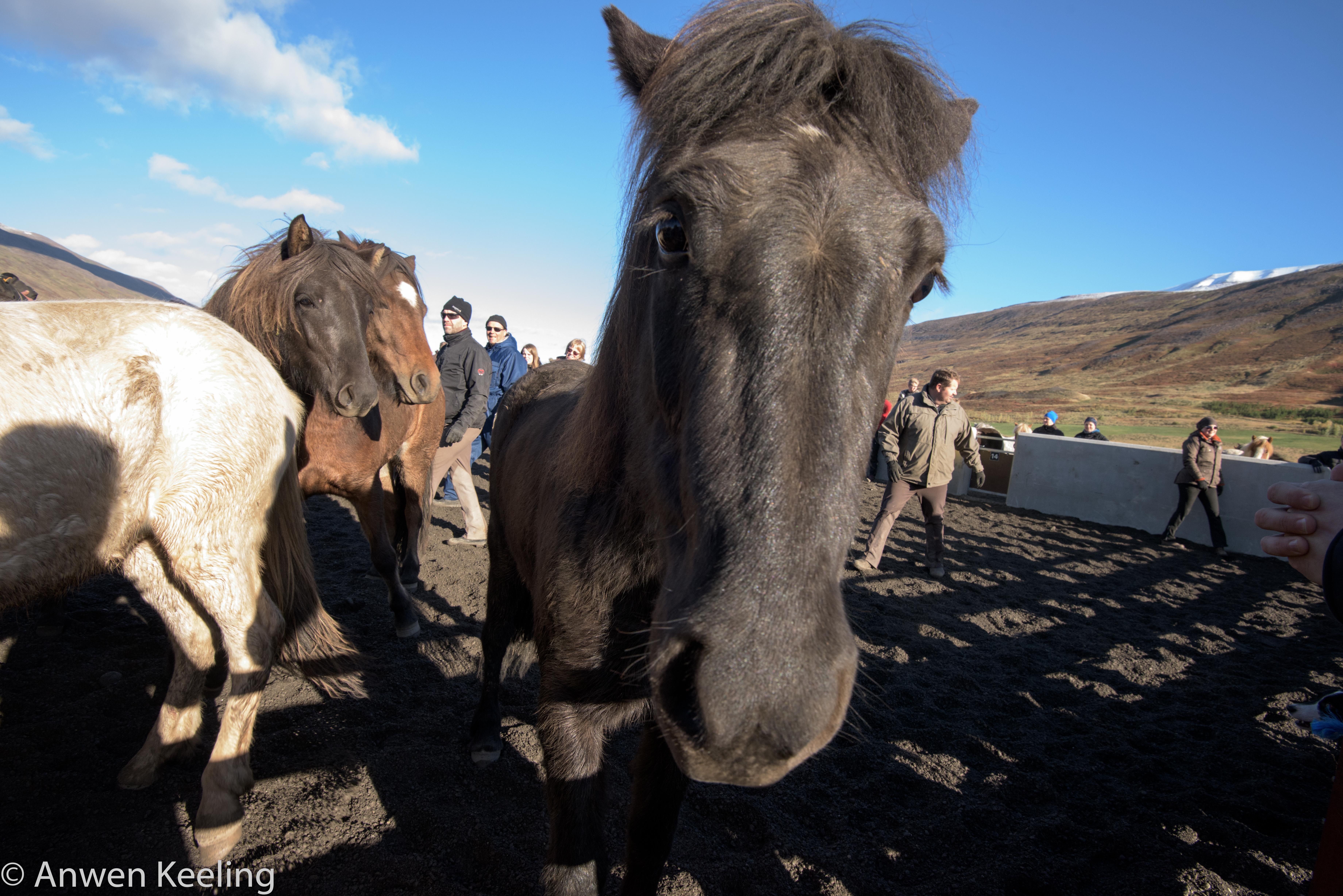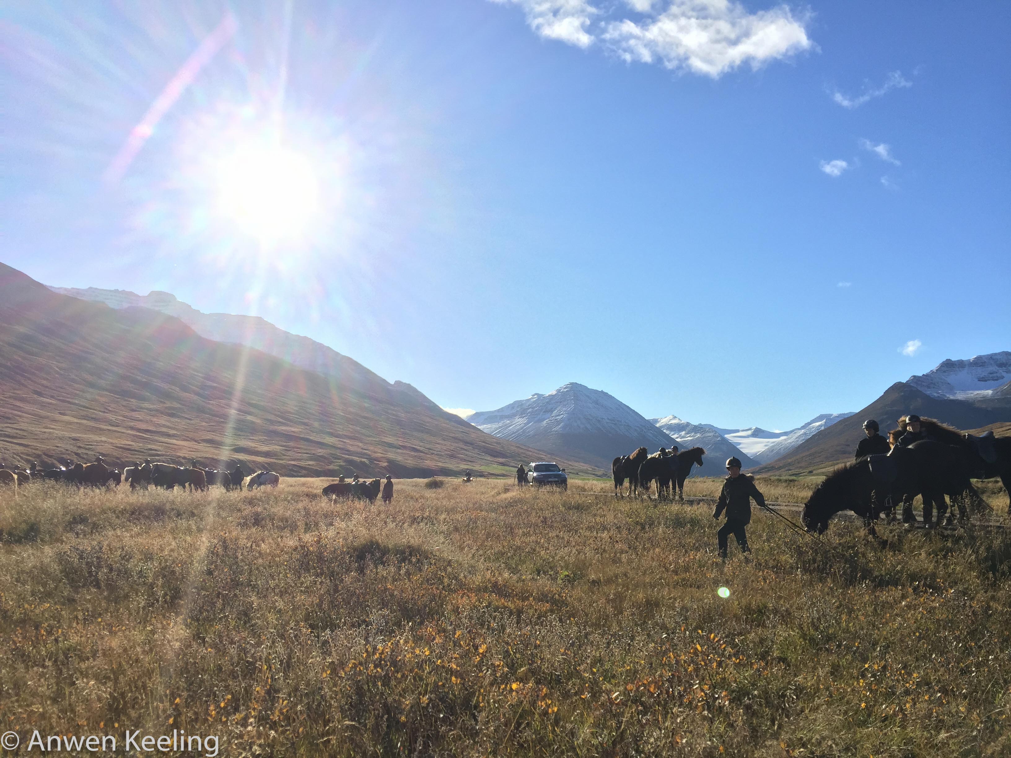 There were 134 young Icelandic horses in the holding pen awaiting the run down the valley. I was assigned to the vanguard- our aim was to lead the stampede. We set out quite fast down the road before the others let the herd out who would follow… the aim was to not let the herd overtake us. My trusty little grey horse was super- keen to go and easy to sit on with his smooth type-writer gates. About 10 of us were in this front group. They seemed to use farms as marker points, and had people stationed in cars along the way blocking roads or exits up to the mountains. We had two breaks on the way where we hopped off the horses to let them get their breath back, and herded the loose horses into a partly fenced area (one fence line and the rest of us standing around holding a piece of rope as a fence). This was to give them and us a break before then next stretch. Towards the last stretch I am not sure whether all the horses knew we were approaching the sorting yards, but there was a last-ditch effort by the horses at the front to get past us, some fun riding entailed trying to cut off the racing loose horses and keep them in the herd. There were a few hundred people milling about at the yards on our arrival, so we galloped in the yards and all the horses followed, we quickly dismounted and moved to the side to let the steady stream of horses follow. Our horses flanks were heaving. Saddles were thrown to the side and all the ridden horses were released into the paddock to have a good roll and relax before stage 3 of the operation! Stage 2 being sorting of the young horses, and stage 3 was delivering them to where ever they were meant to go!