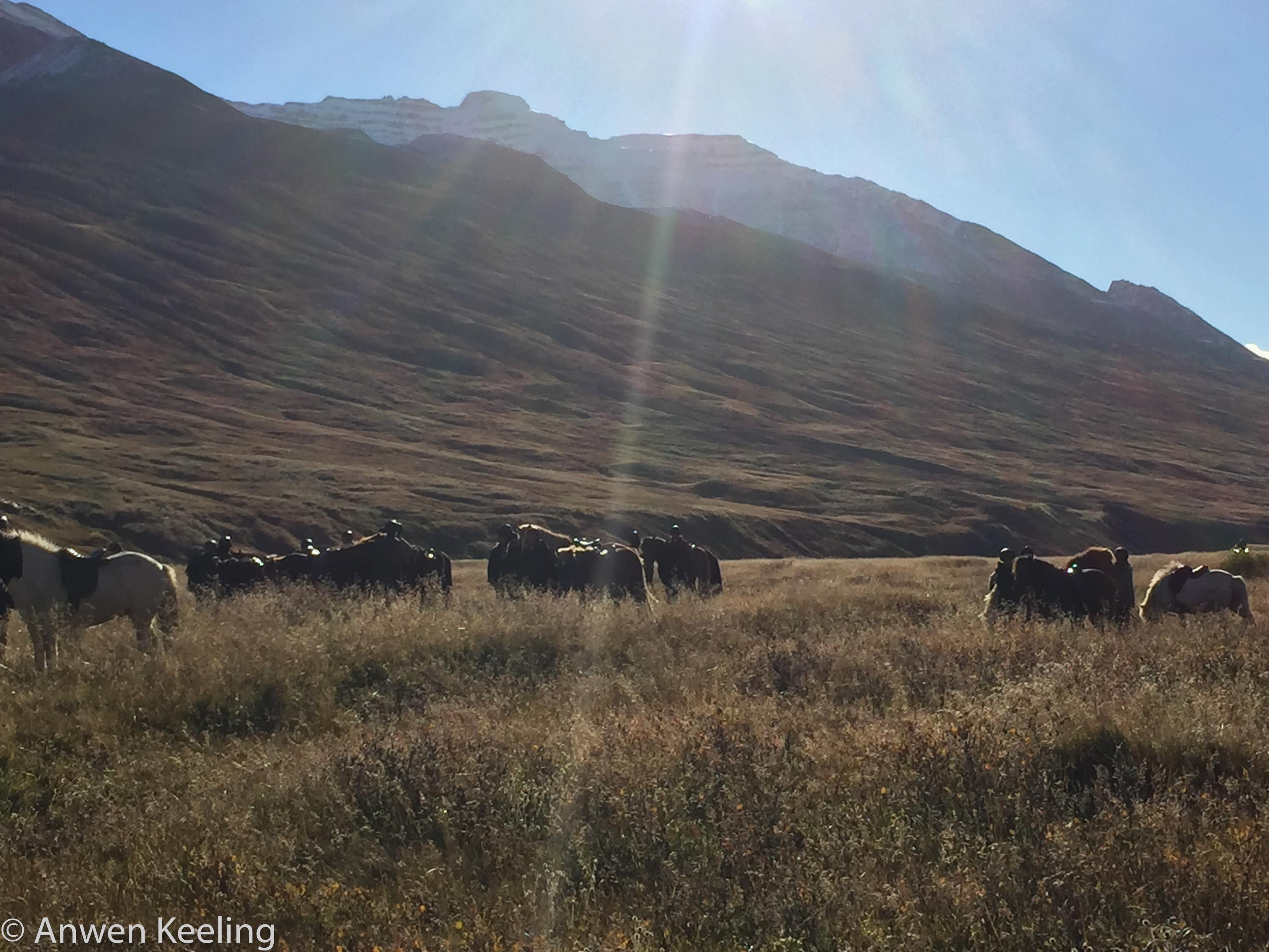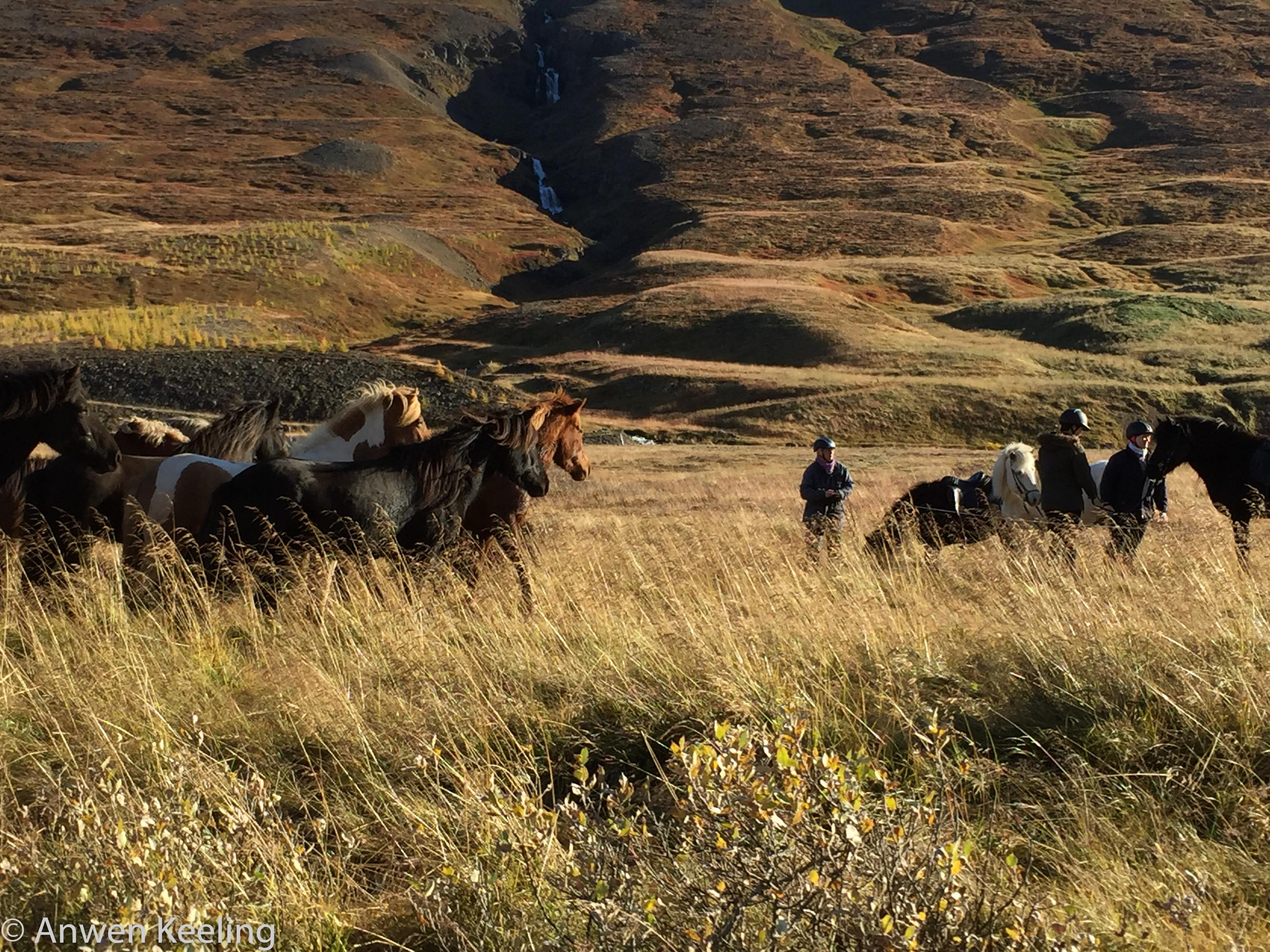 I happily abandoned my post at my easel, for a couple more days in the saddle with Simbi and his lovely Icelandic horses. On Saturday there was an important event, the annual muster and sorting of the Icelandic ponies. All the local farmers put all their young horses out in the mountain pastures for summer- and it was time for them to come in for some training and the winter. I was desperate to succeed at herding something on horse back after my abject failure with the sheep so I jumped at the opportunity to join them! My adventure pants were ready for their next installment….